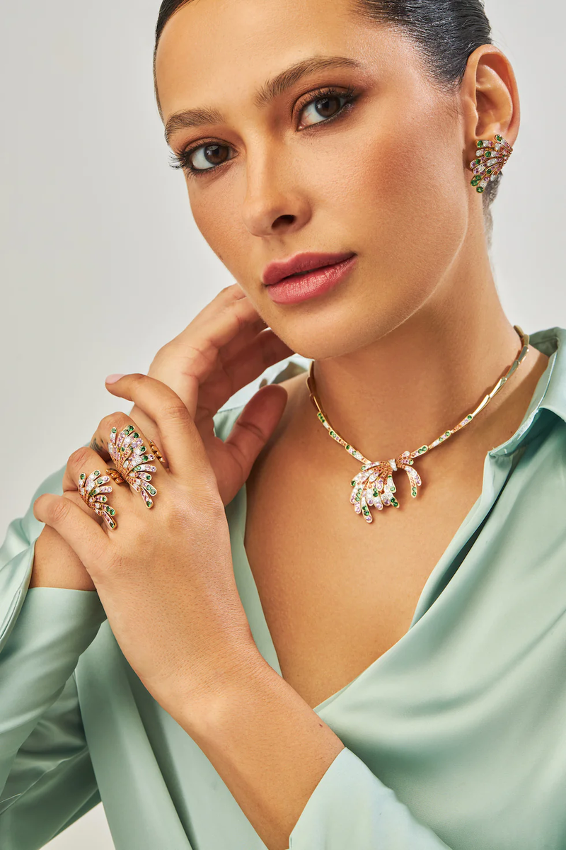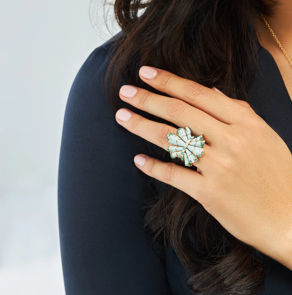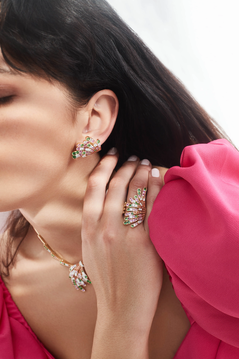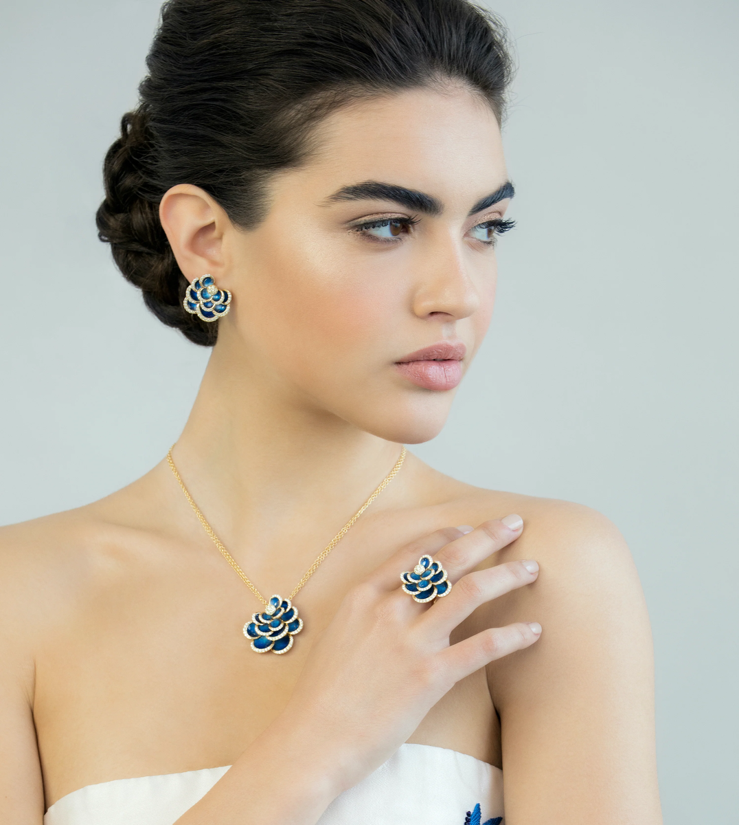 Коллекция FerriFirenze Petals родилась из такого видения. Это был день, когда краски в садах вилл были усилены весенними ливнями. Один конкретный лепесток рос и размножался, улавливая и отражая блеск капель дождя. Его оттенок менялся по мере созревания. Пока они не превратились в кольца, подвески и серьги игривых оттенков зеленого малахита, темно-синего и бирюзового.