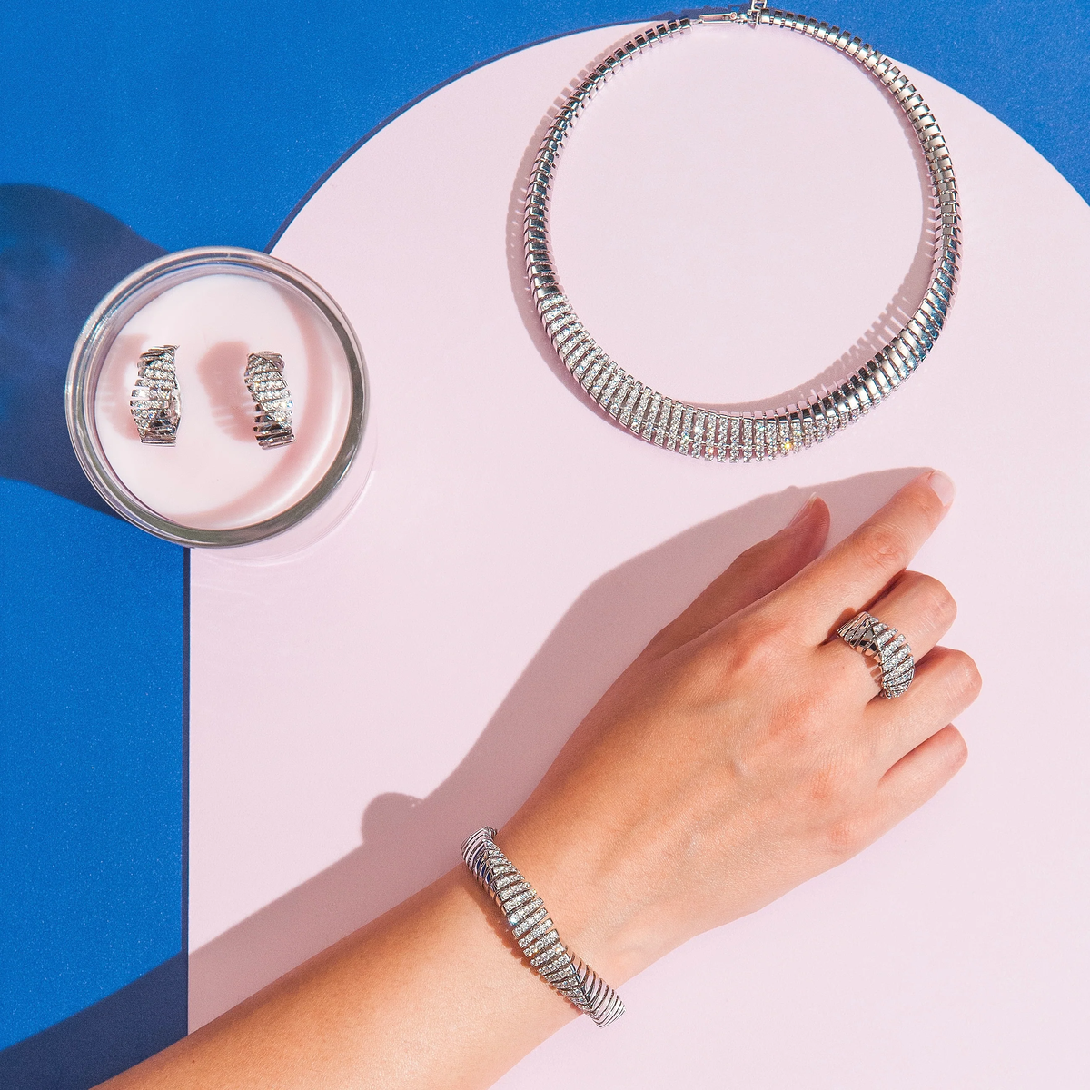 Подвески, кольца и серьги Плиссе бесконечно элегантны. Тем не менее, они без особых усилий изысканны. Тончайшие россыпи бриллиантов словно подвешены над каждой оправой, словно завернутые в марлю, а затем подхваченные летним ветерком. Как и изысканная мода, эта шикарная коллекция обладает уникальной привлекательностью. Он остается неотразимым для тех, кто очарован его плавной формой.