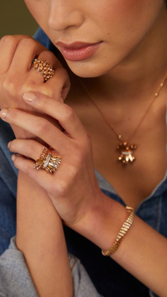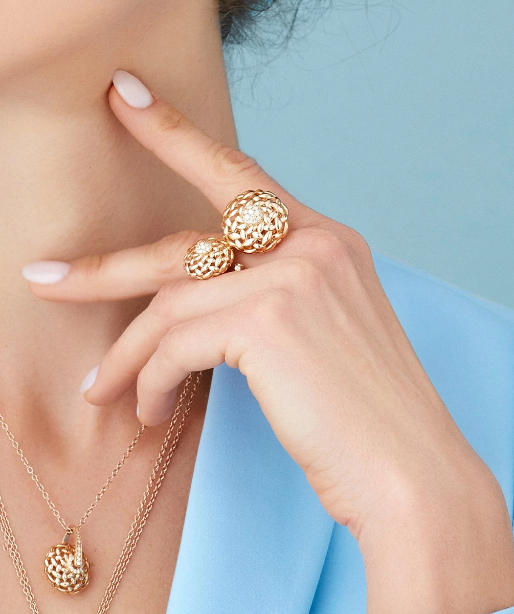 В свою очередь, мастера переняли многие из этих поразительных форм, используя их в качестве основы для создания собственных подвесок, колец, браслетов и серег Giotto от FerriFirenze из 18-каратного золота. Шампанское и белые бриллианты служат изысканным акцентом, придавая украшениям четкие и необычные формы.