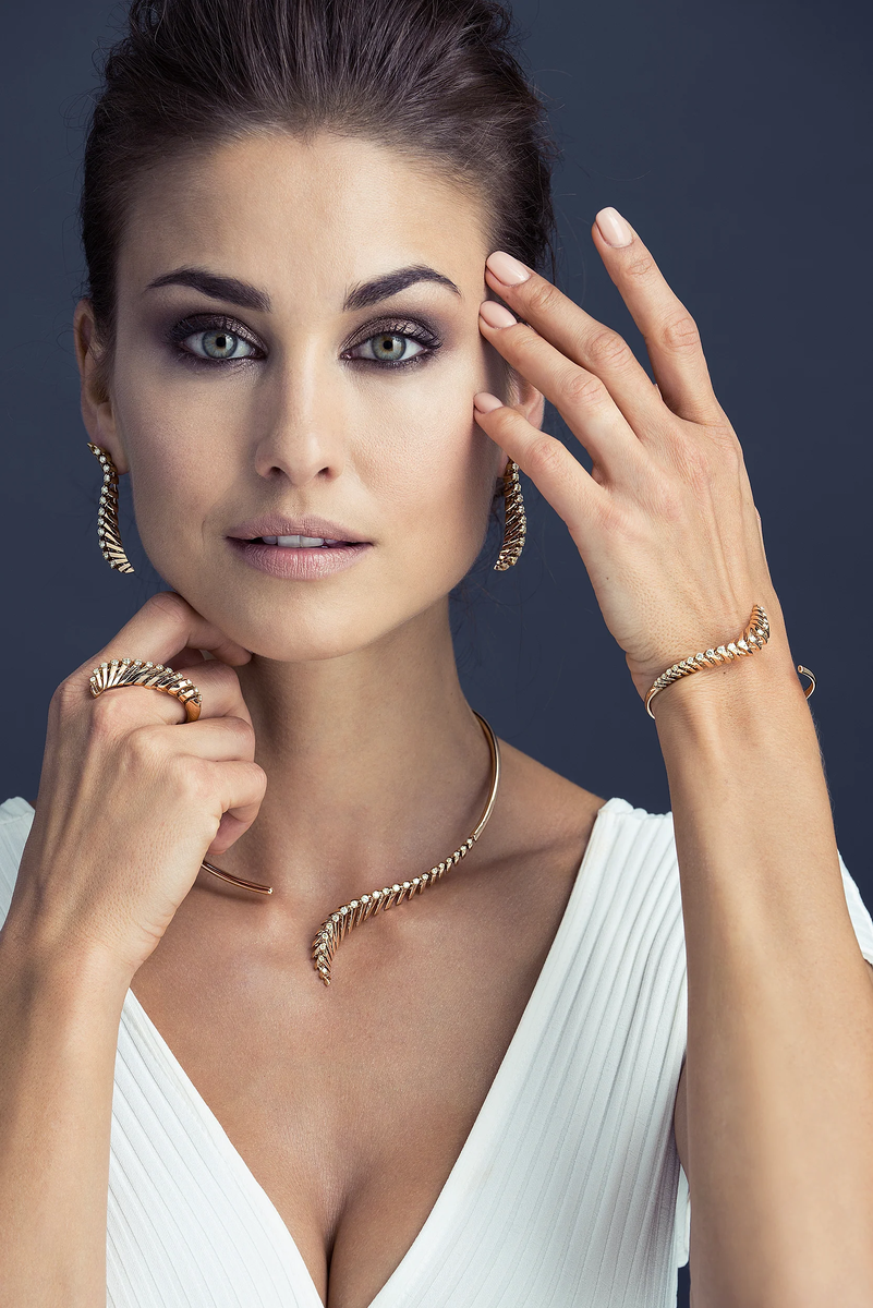 Ожерелья, браслеты, кольца и серьги состоят из изящных изгибов. Vito - это тропинка, петляющая под пологом леса из мягких зеленых листьев. Он сгибается, выпрямляется, опускается и поднимается. Но предметы коллекции остаются полной противоположностью жесткости. На самом деле, их контуры мягкие на ощупь, почти приятные. С течением времени эти изделия порхают по коже владельца: обвивают шею, запястье и изгибаются вокруг уха.