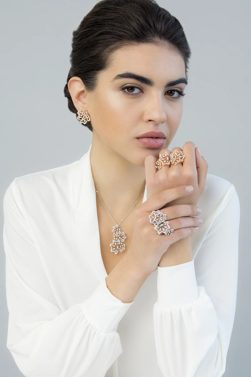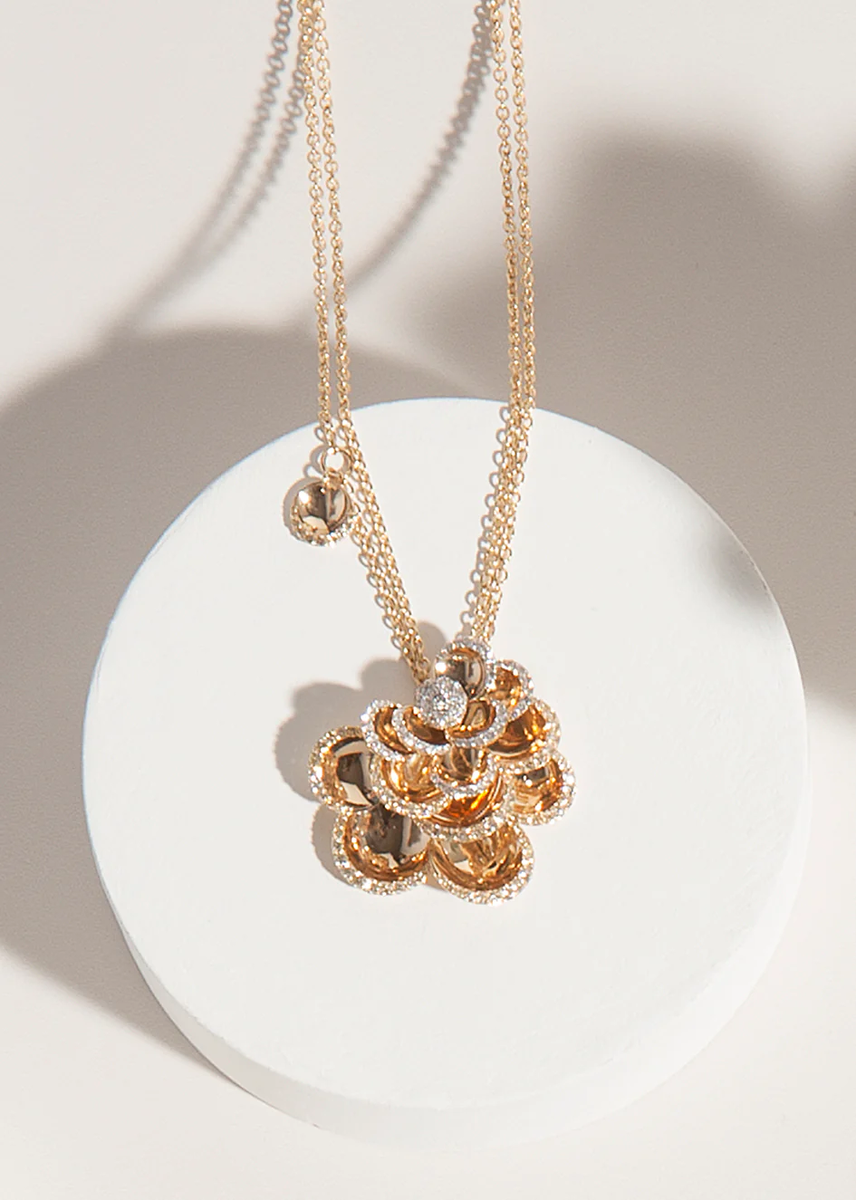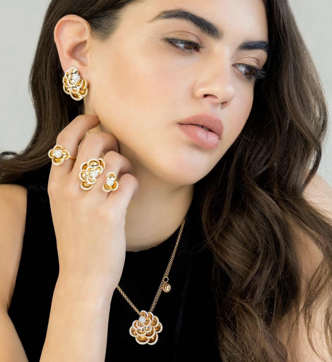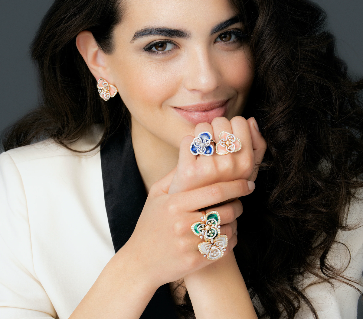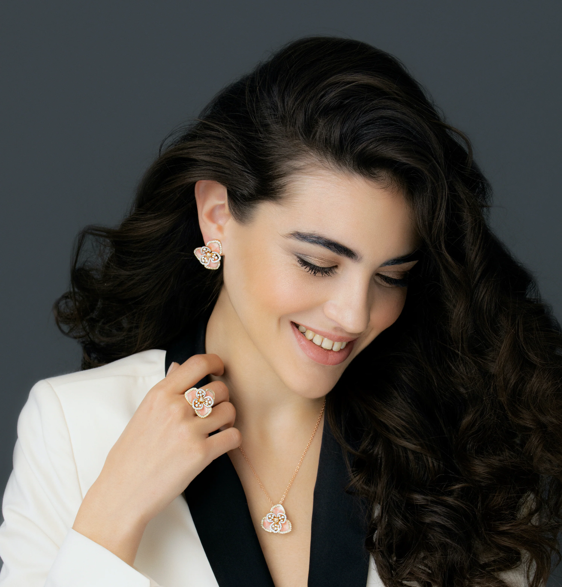 Поразительный контраст черной эмали с белыми бриллиантами делает коллекцию Petals ультрасовременной и современной. Тем не менее, ювелирные изделия выглядят классическими, когда розовое золото сочетается с бриллиантами. Настройки могут быть фиксированными или сформулированными. Это позволяет лепесткам танцевать в ритме движений владельца.