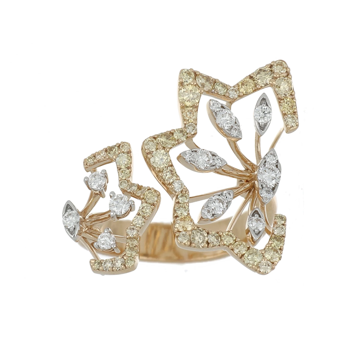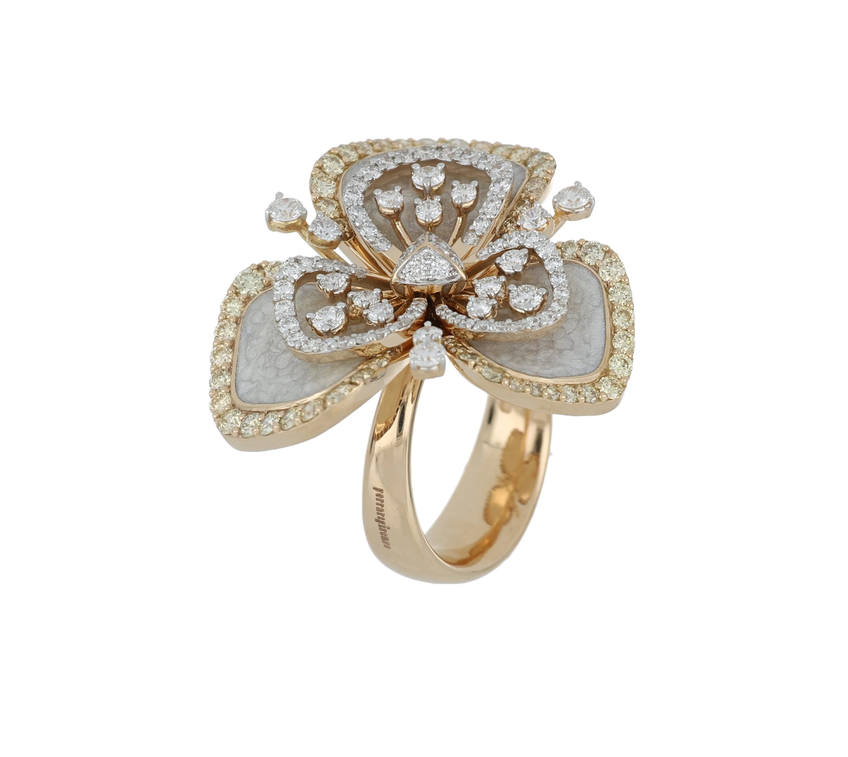 Кольцо с клевером, розовое золото 18 карат, белые бриллианты и бриллианты цвета шампанского.