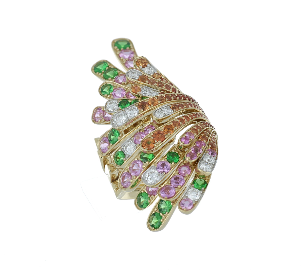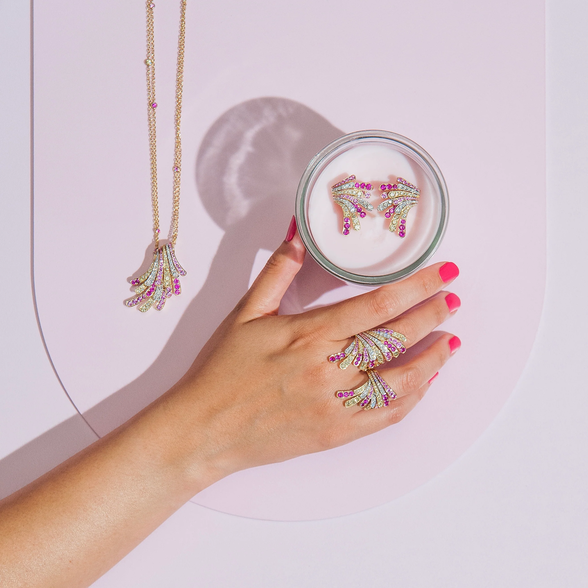 Коллекция FerriFirenze Waterfall сочетает в себе как традиционное, так и современное. Ожерелья, серьги и кольца были тщательно обработаны, поэтому их драгоценные камни переливаются и переливаются, подобно нежным волнам, по изгибам 18-каратного золота. Когда солнечный свет падает на эти разноцветные драгоценные камни, они падают и каскадом переливаются по контурам кожи владельца. Эффект напоминает полупрозрачную реку, падающую водопадом в непрозрачные глубины внизу.