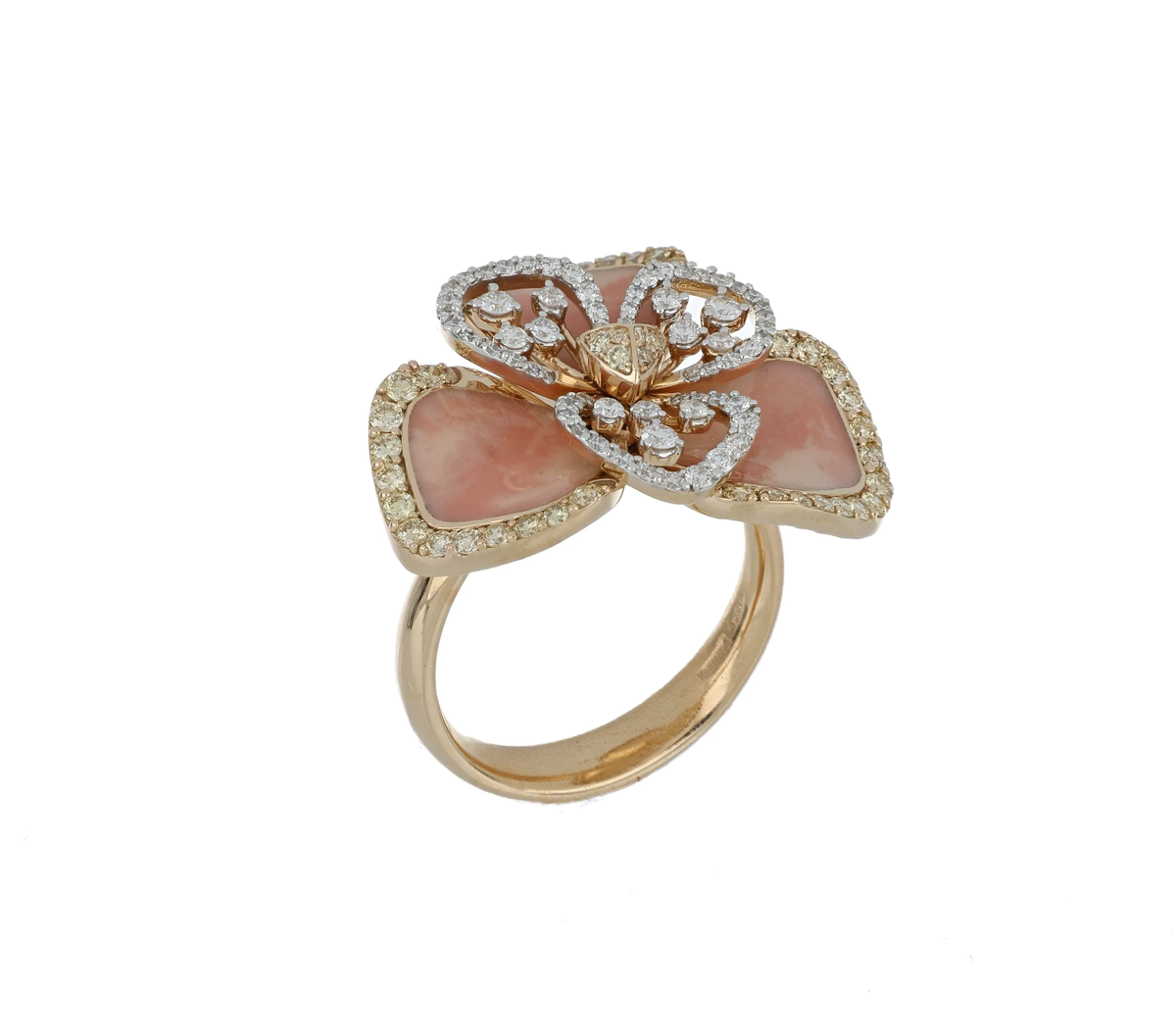 Кольцо "Клевер", розовое золото 18 карат, белые бриллианты и бриллианты цвета шампанского, перламутровая эмаль