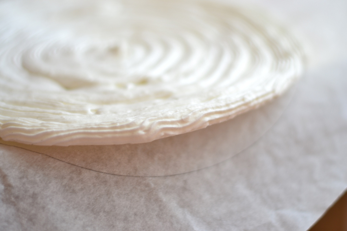 Получившуюся пышную массу выкладываем в кондитерский мешок и рисуем круг диаметром 20 см,такие же должны быть и медовые коржи.