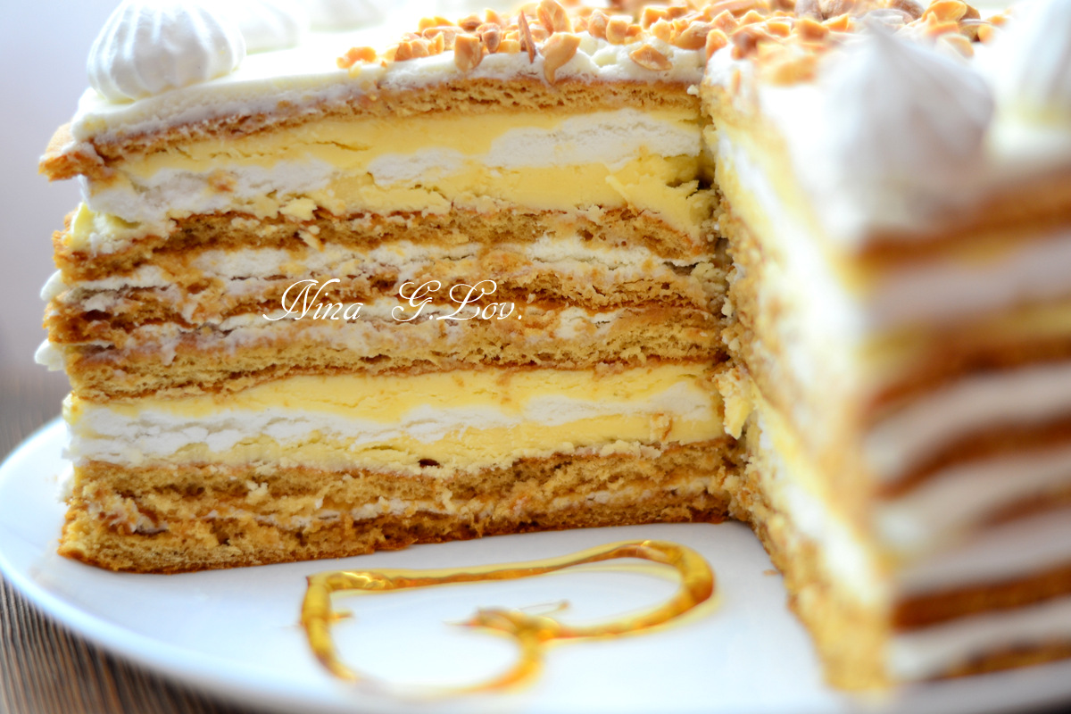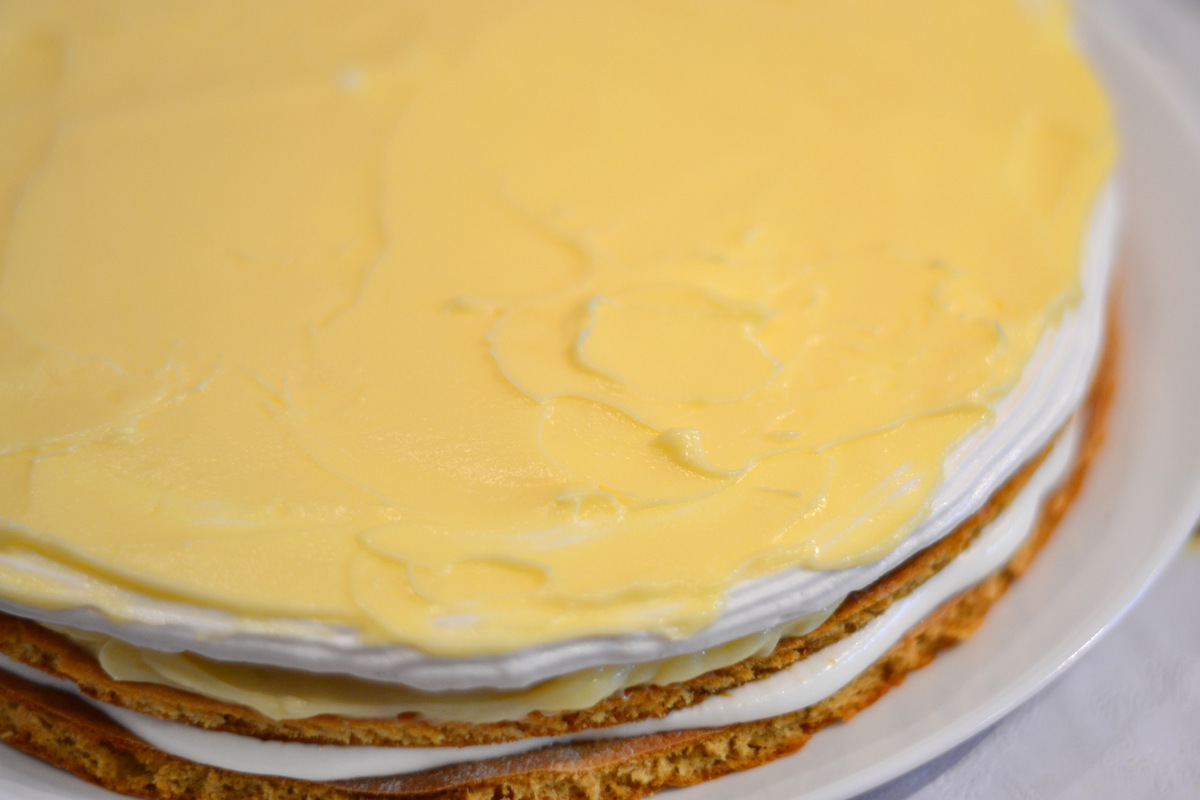смазываем его масляным кремом,кладем на него корж медовый.Теперь все сначала по тому же принципу. Главное,чтобы коржи- безе были смазаны снизу и сверху только масляным кремом,так как если будет сметанным,безе растает и будет мокрым.