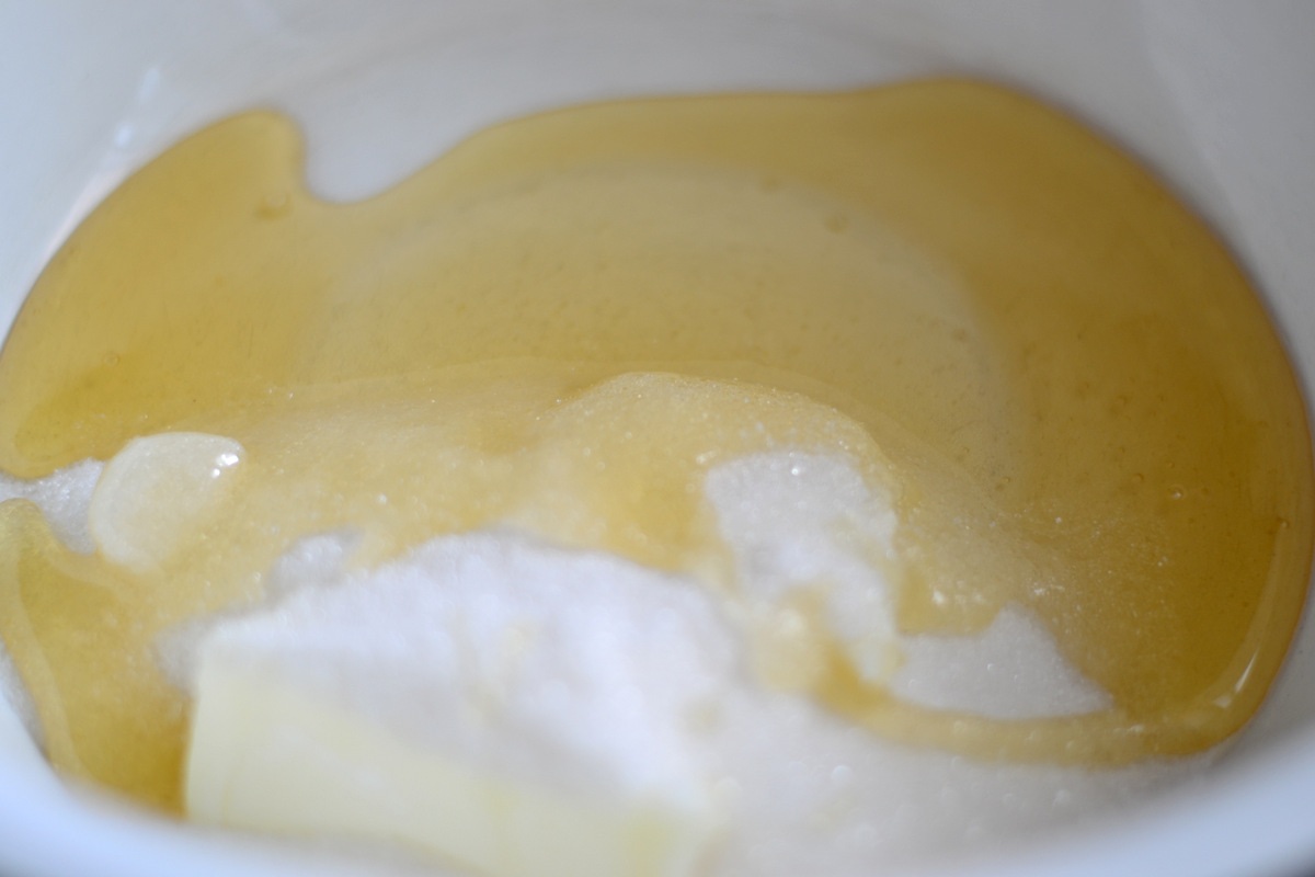 Ставим на водяную баню емкость,желательно глубокую,в нее кладем мед,сахар и сливочное масло,ждем,пока масло растает и сахар начнет немного растворятся,мешаем венчиком.