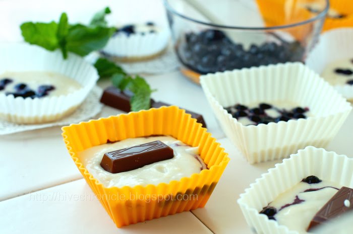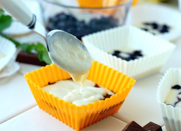 Выложить в формочки чередуя слои: тесто- ягоды- тесто- шоколад- тесто- ягоды. Предварительно разогреть духовку и выпекать при температуре 190 *С - 20 минут.