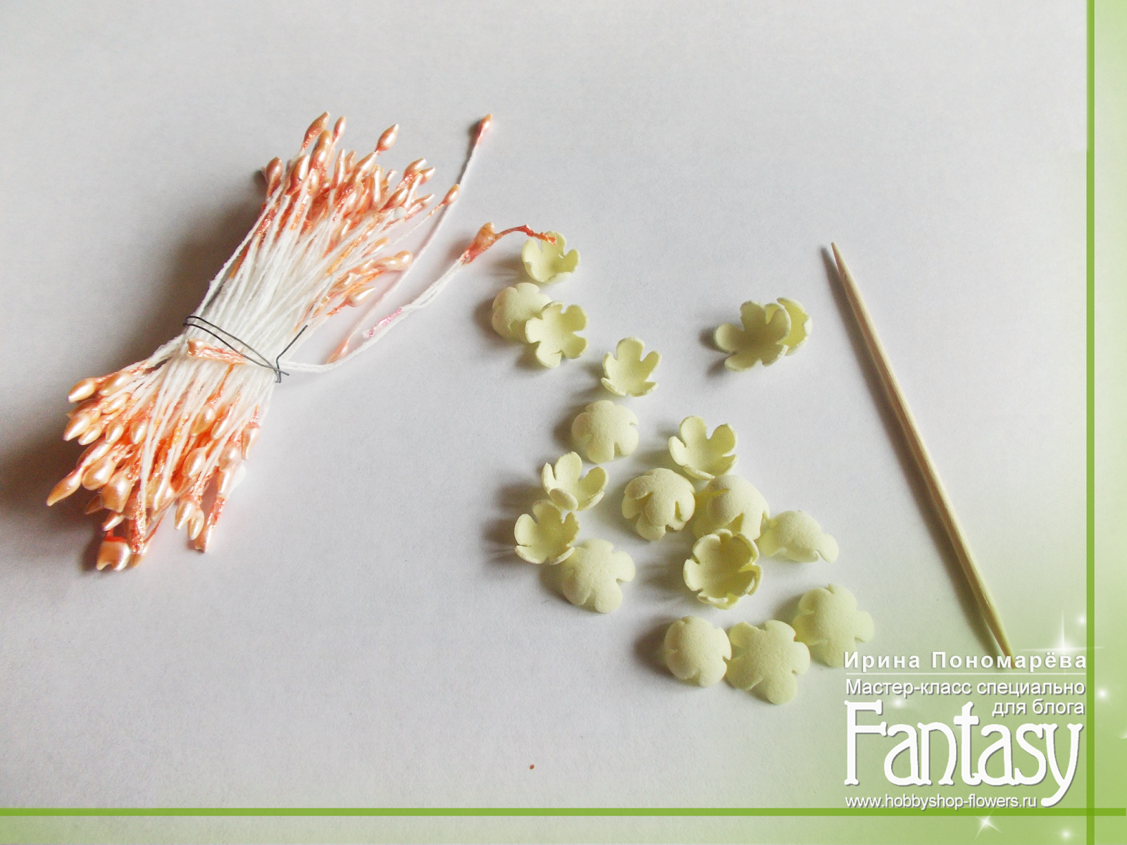 3. В каждом цветочке прокалываю зубочисткой отверстие. Тычинки разрезаю пополам и вставляю их по одной в цветочки. С помощью клея фиксирую тычинку. Клей, которым я пользуюсь - схватывается почти сразу.
