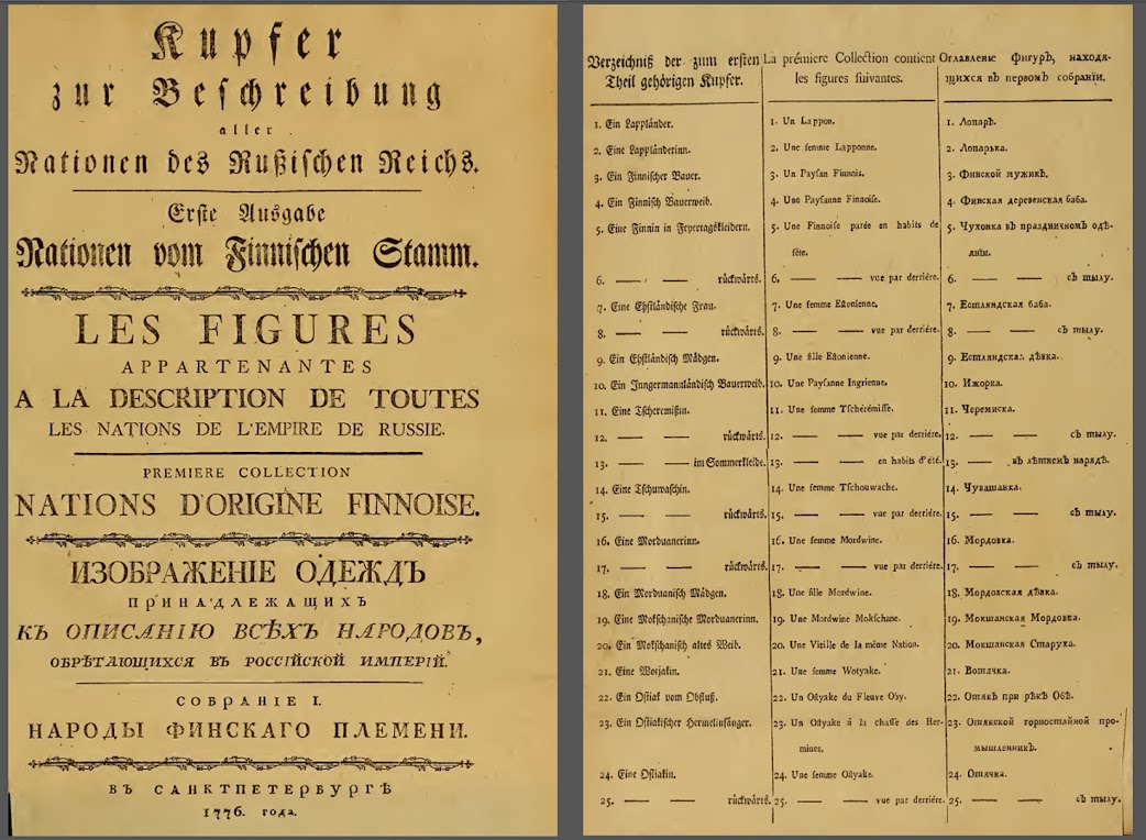 "Первоначально самыми многочисленными в Российской империи является Финские народы и Татарские народы. Собственно, кроме Финнов (Finnois), Лапонов (Lappons), Эстонцев (Essttboniens) и др., там еще живут Черемисы (Tschérémisses), Чуваши (Tschuwaschen), Мордвины (Mordwines ), Вотяки (Wotïakes), Вогулы (Wogoules), Остяки (Ostlïakes). Все они делают значительное число финского народа ... "// том I, https://archive.org/details/descriptiondetou01geor
