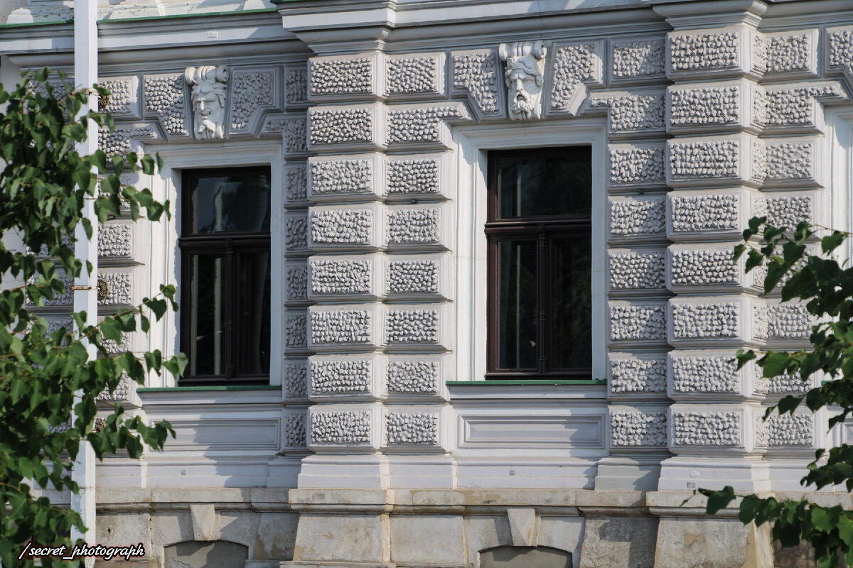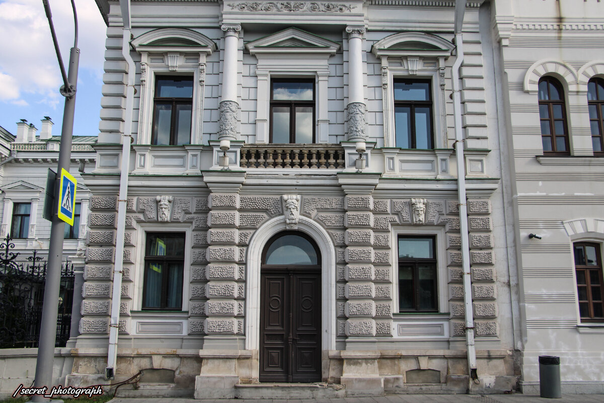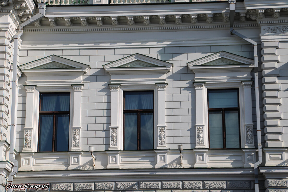 По тем временам здание даже считалось довольно скромно, хоть и изящно оформленным. Сейчас бы я сказал, что дом чрезвычайно наряден. Рустованный первый этаж и облицованный плиткой второй, классически оформленные окна, аттик с резной оградкой.