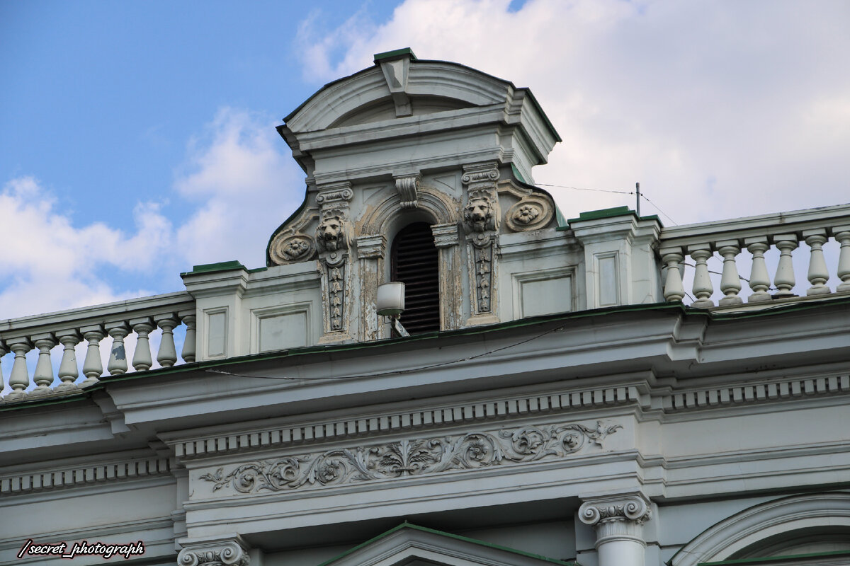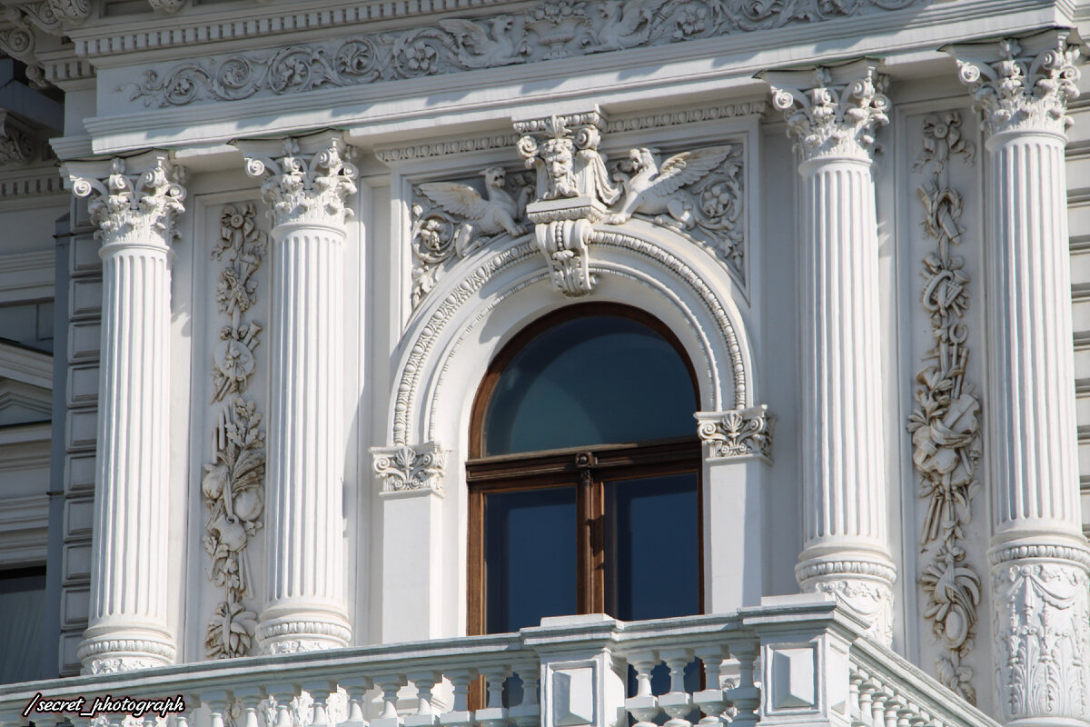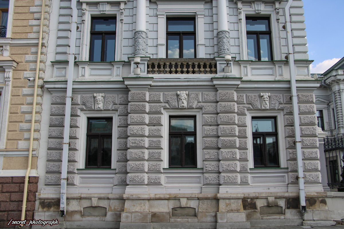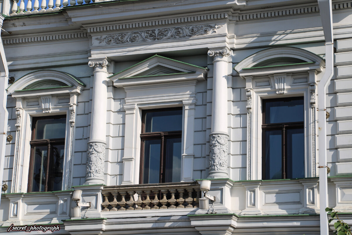 Но особенно выделяется центральный ризалит! На его втором этаже – великолепный, вытянутый вперед балкон, так и притягивающий взгляд! (Опять же! – почему я не замечал этого дома раньше?!) Балкон покоится на четырех тосканских колоннах, украшен витиеватой растительной лепниной и охраняется крылатыми львами.