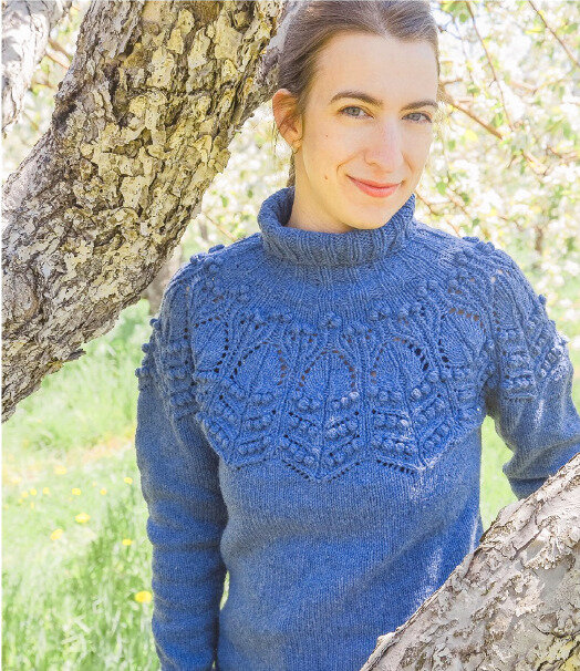 9 ряд: (1 изнаночная, шишечка, накид,(1 изнаночная,1 лицевая скрещенная)дважды,1 изнаночная, накид, шишечка) до конца ряда