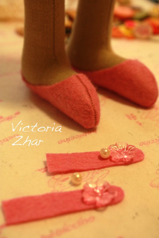 затем эти полосочки пришиваем или приклеиваем. внутреннюю часть я предпочитаю приклеивать, так как заправляю внутрь туфли. если начать ковыряться там иголкой, то фетр по краю скорее всего растянется и будет выглядеть неряшливо. а с внешней стороны можно без проблем пришить, но и тут я частенько приклеиваю. раз клей уже достала, то почему б не сделать пару лишних капель :)