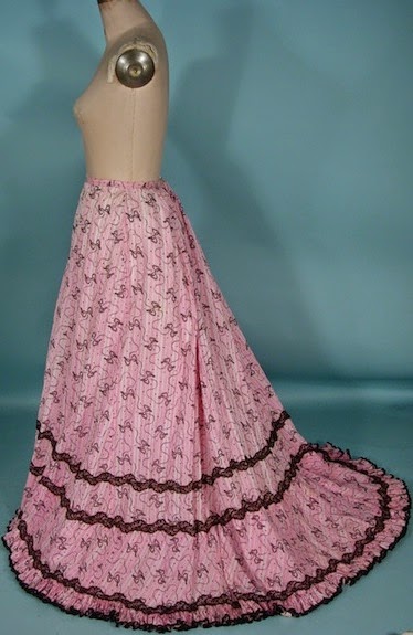 Юбка была в форме колокола, удлиненного треном, с подолом, отделанным оборками. Линия талии располагалась на естественном месте и лишь спереди была несколько занижена.