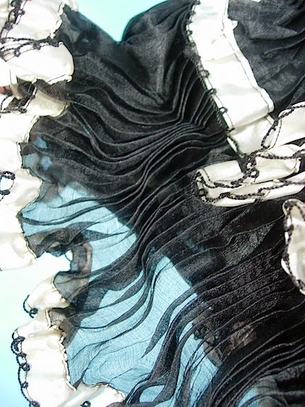 С большой шляпы свисала завязанная под подбородком вуаль, составляющая одно целое с пенистым жабо, доходившим до пояса, что создавало впечатление пышного бюста.