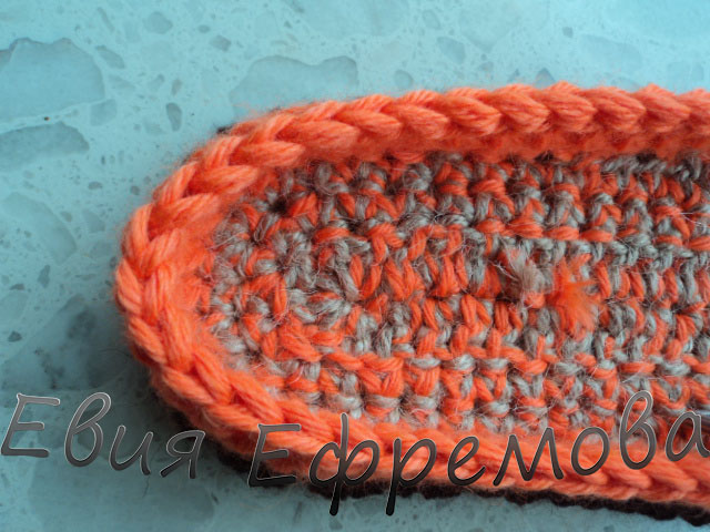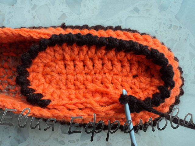 коричневые ниточки. Отступив от мысочка 7-8 см, оранжевыми нитками в 2 сложения