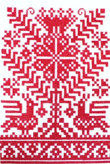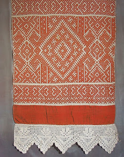 Подол – первый ярус, он ближе к земле. На нем, как правило, ромбо-точечные или крестообразные композиции (символы земледелия, плодородия, огня). В вышивке головных уборов преобладают солярные знаки, изображения птиц. В женском костюме узор, расположенный по переду, всегда в первую очередь защищает его владелицу и ее ожидаемое дитя, а вот в мужском костюме – в первую очередь активно воздействует на окружающих, а собственно защитный узор идет со спины – этим и объясняется наличие «женской» символики на грудной вышивке мужских рубах, особенно праздничных, свадебных.