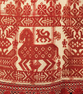 Вышивки с изображением коня многообразны. Например, кони-птицы или кони, расположенные по сторонам женской фигуры или цветущего дерева и несущие на себе всадника. Конники – знаки и времен года, знаки равноденствий, зимнего и летнего, которые отмечал народ праздниками и обрядами. Часто встречаются двуликие кони и даже четырёхкратное изображение коней, символизирующее четыре стороны света. На конях часто изображали всадниц – богинь весны. Сложный орнамент в виде двух симметричных всадниц верхом на конях, повернутых к древу жизни, искусствовед Маслова Г.С. называет «встречей весны».