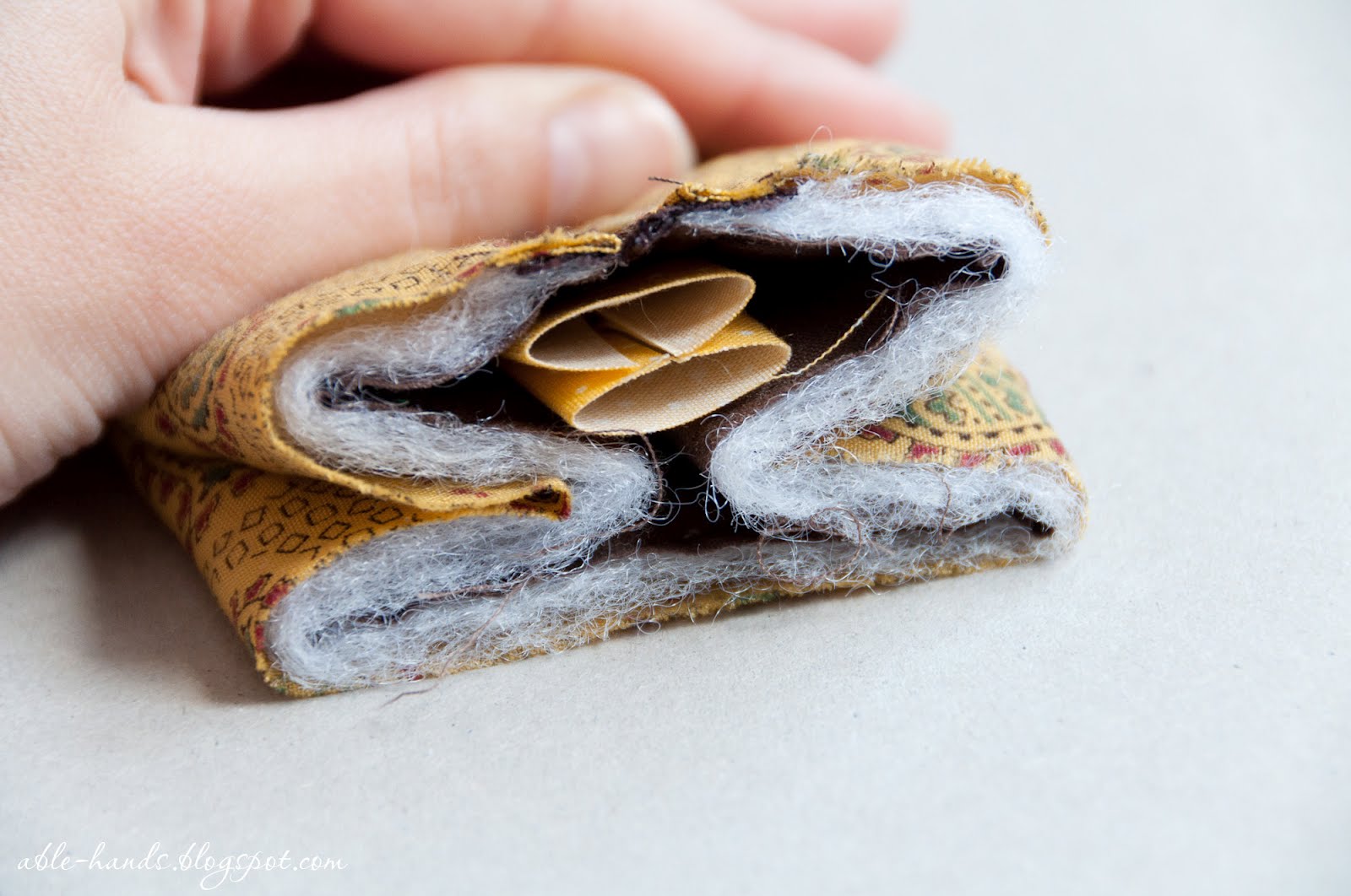 Застегиваем молнию практически до конца, закрепляем несколькими стежками край, который будем обрезать, и обрезаем лишнее. Получившийся цилиндр выворачиваем подкладкой наружу, складываем пополам вдоль молнии и помечаем середину. Совмещаем молнию с этой серединой, и к этой же точке загибаем боковые части.