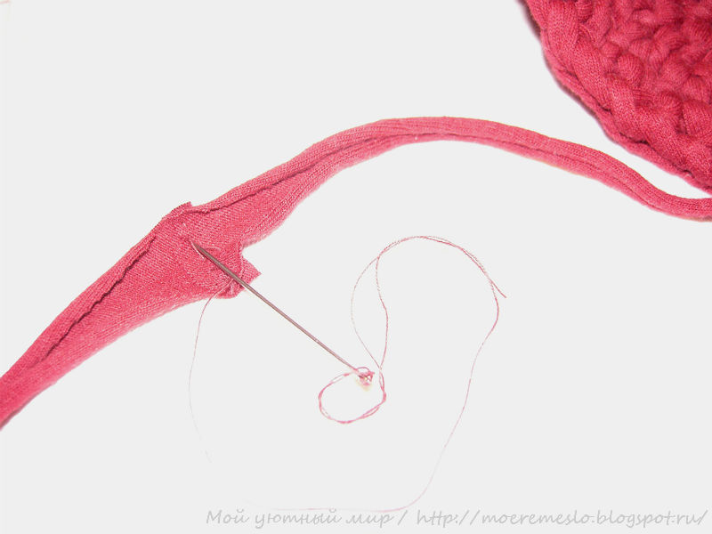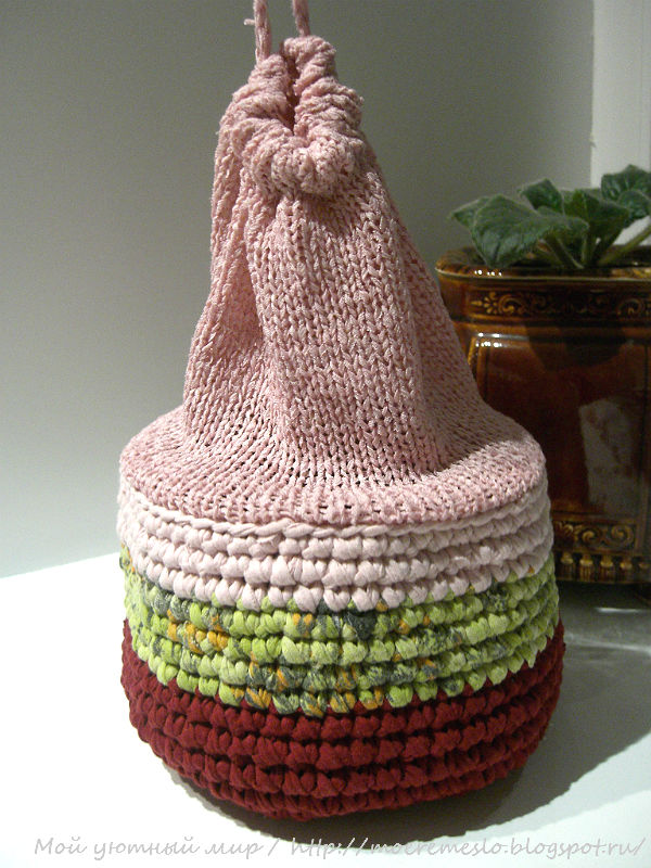 Пришиваем часть от топика к корзине, продеваем шнурок, он будет затягивать мешок и клубки не убегут...