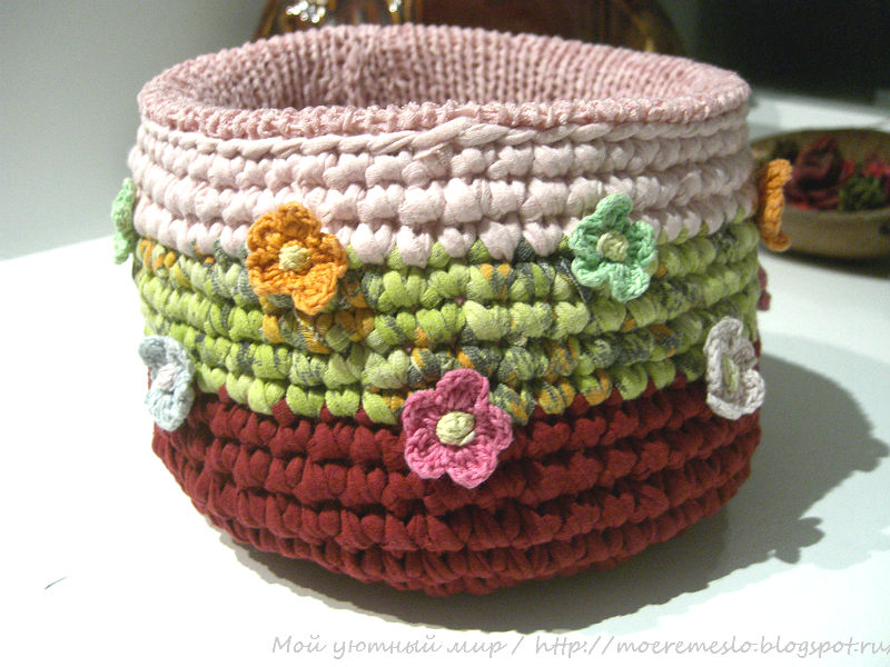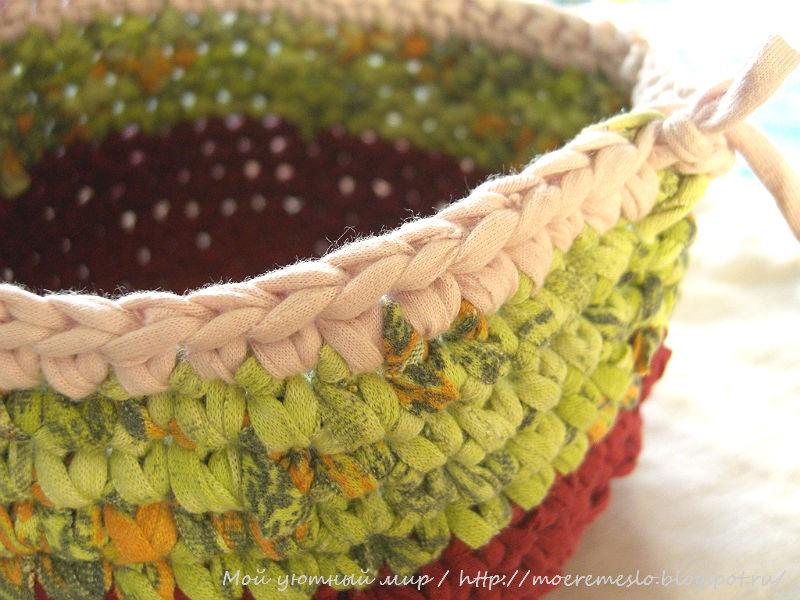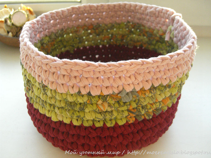 Далее полёт фантазии: высота корзины, цвета полос или вообще без них. У меня полосатая, новый цвет я пришила к старому как описано выше и вот что получилось.