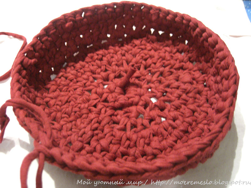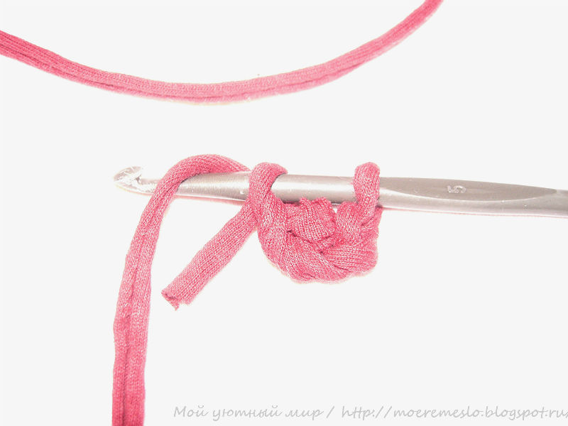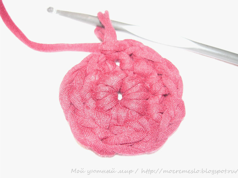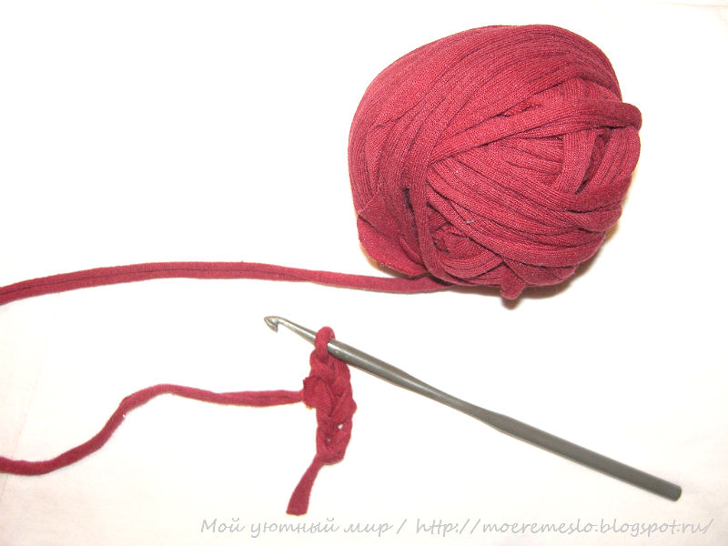 Для работы берём пряжу из футболок, которую мы заранее сделали, крючок и вперёд! Набираем цепочку из воздушных петель (их количество зависит от толщены пряжи, главное, чтобы не получилось большой дырочки в центре ) и замыкаем их в круг...