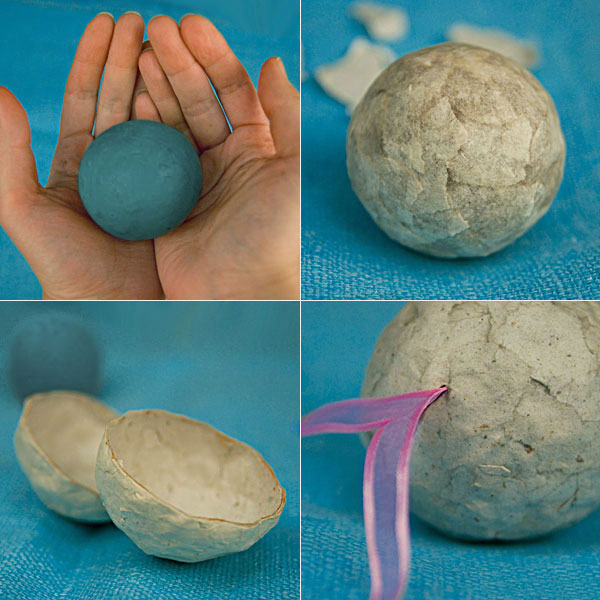 После того, как бумага на пластилиновом шарике полностью высохнет (для этого достаточно оставить ее на ночь, но не на батарее), используя канцелярский нож, разрезаем форму на две части и снимаем получившиеся «чашечки» с пластилина. Соединяем детали, проклеив их по шву кусочками оберточной бумаги, смазанной клеем ПВА. Не забываем предварительно вложить внутрь концы декоративной ленты (их тоже можно закрепить с внутренней стороны кусочками бумаги с клеем).