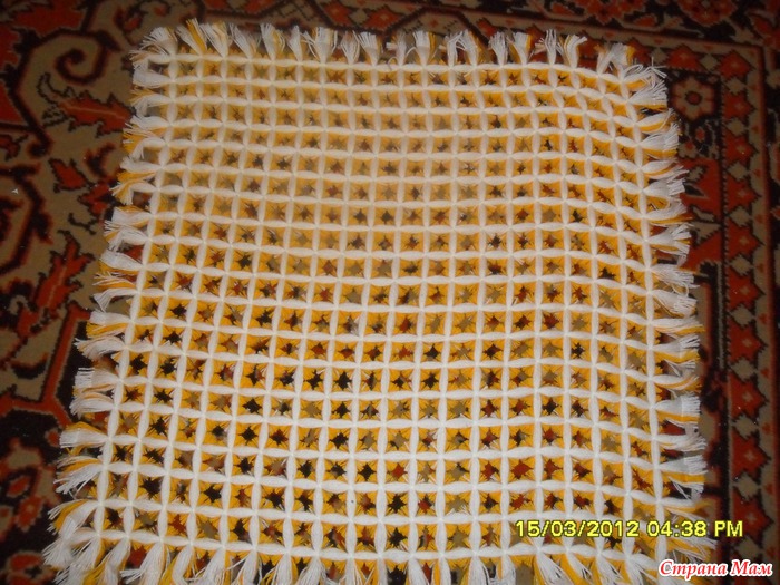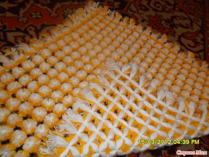 Натянули нитки, перевязали в месте пересечения, а потом взяли ножницы - удобные и острые - и, отступив от места перевязки рядов 3-4см, разрезаете белые и желтые рядочки. Первые - нижние - протянутые 20 рядов остаются на месте, и выполняют роль основы!