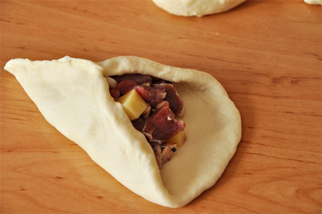 "Отдохнувшее" тесто ещё раз вымесить, и разделить на одинаковые кусочки, размером с небольшой мандарин, примерно 16-18 шт., кусочки раскатать в лепёшки, размером с блюдце, на середину положить начинку, и слепить пирожки в виде треугольников с дырочкой посередине. Эта дырочка нам нужна будет для того, чтобы залить туда бульон при выпекании.