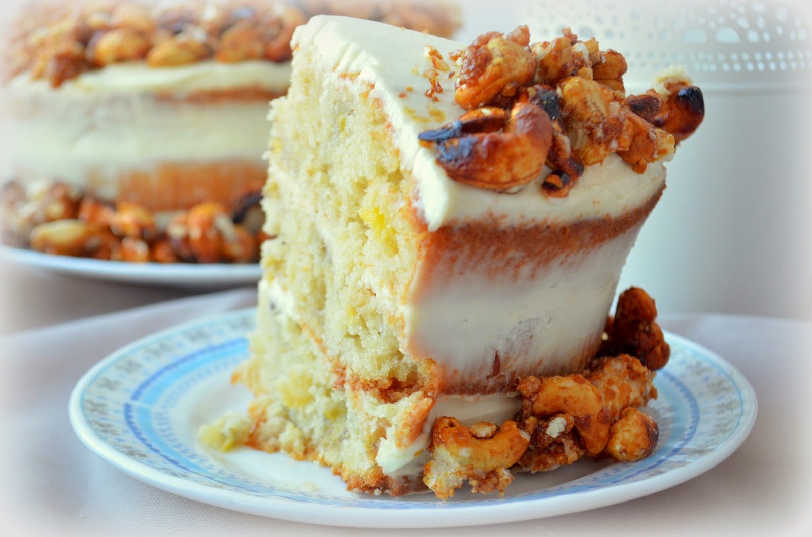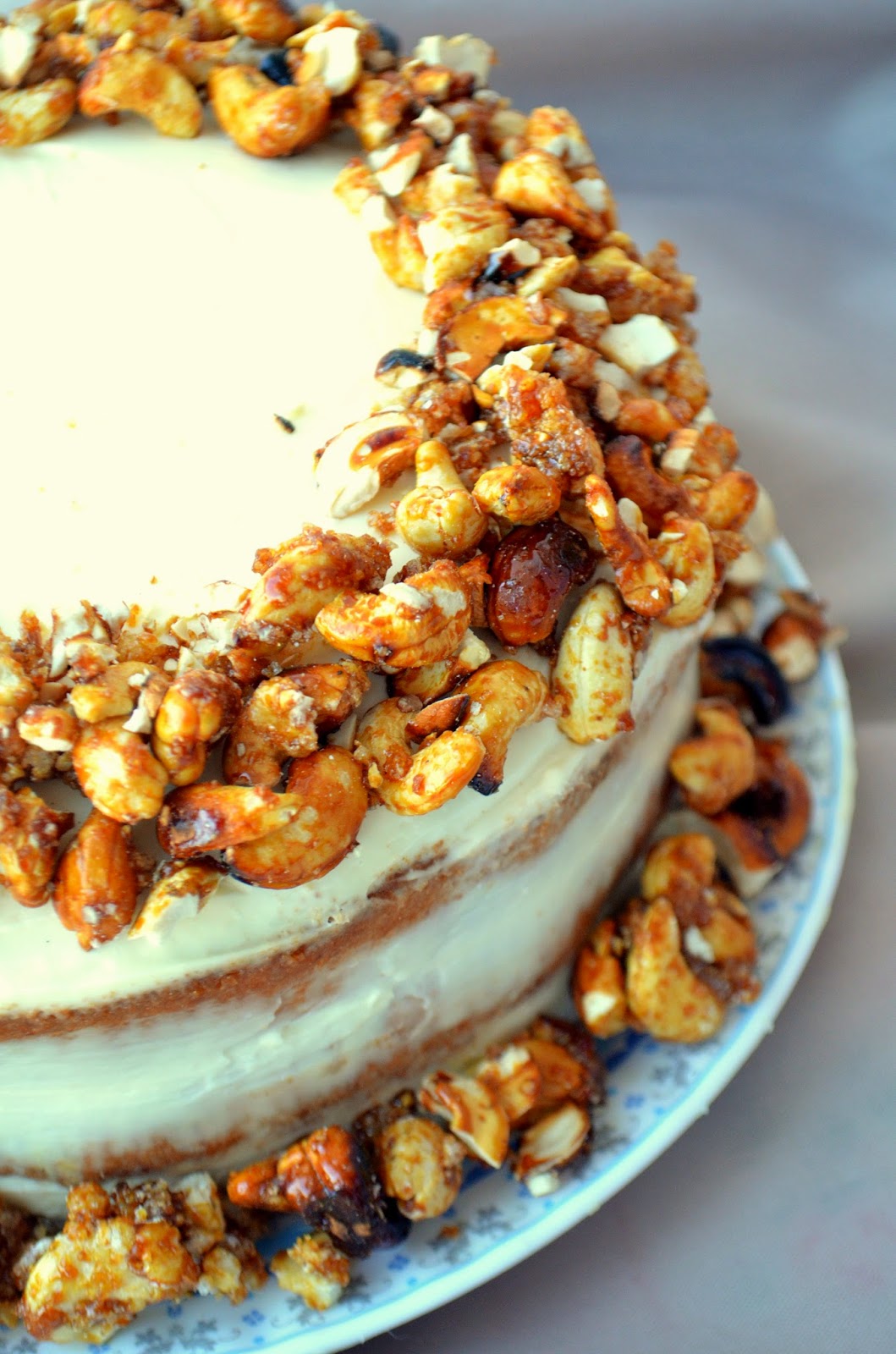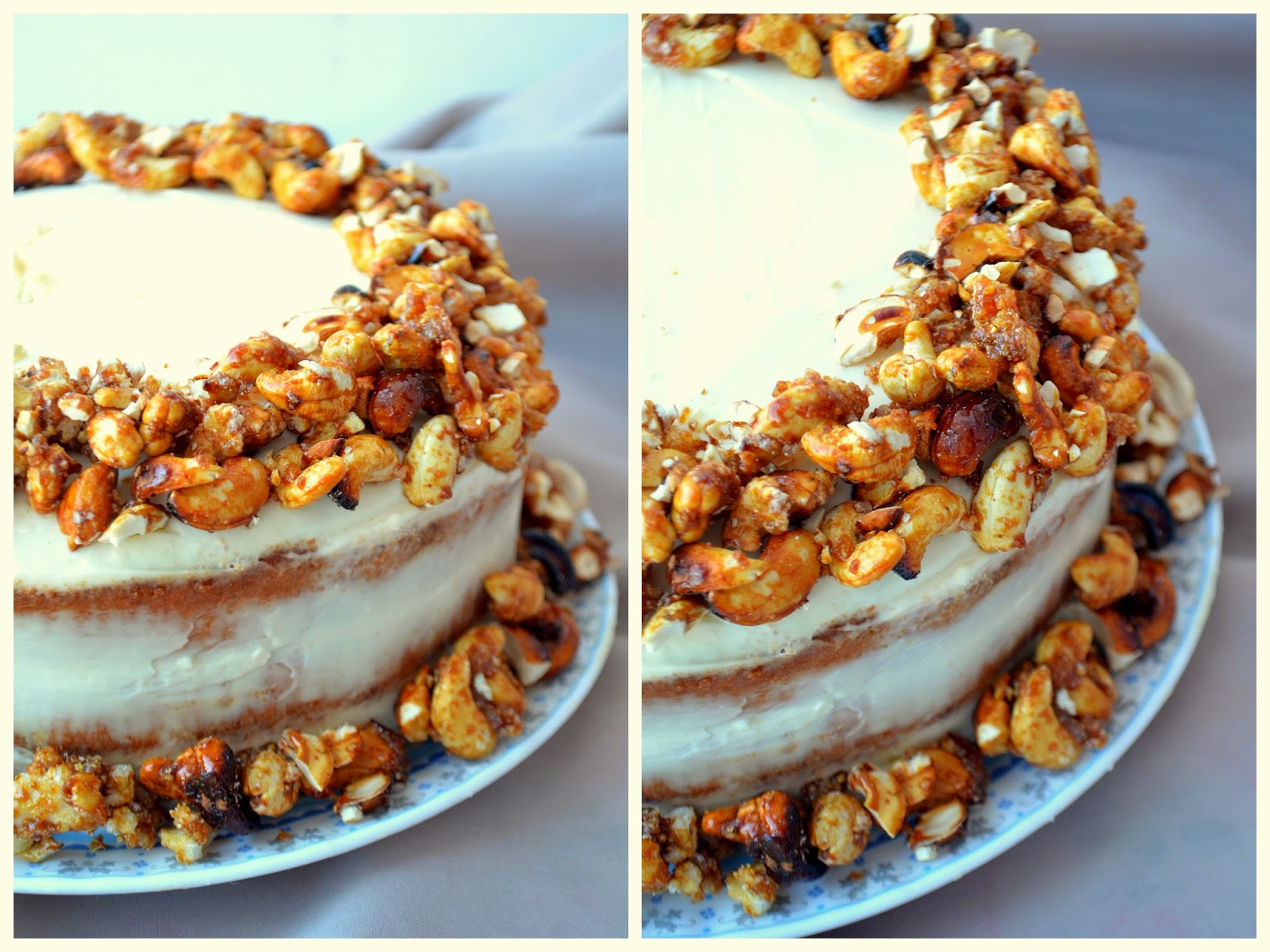 8) Для декора обжариваем на сухой сковороде орехи, затем всыпаем сахар и жарим вместе, помешивая. Образуется карамель, которая покроет орешки. Остужаем и оформляем торт по вкусу.