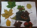 а еще Тима делал аппликацию. Все лето я давала ему рисовать гуашью - кисточку в руках держит уверенно!, поэтому он ловко клеем водил по бумаге, смело прикладывал детали и листья. Сделали аж 2 картинки - вот самая красивая - я только рукава закатывала , чтобы не запачкать и подавала детали - все делал сам!