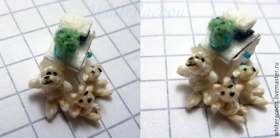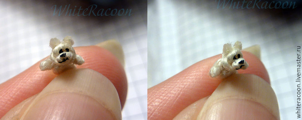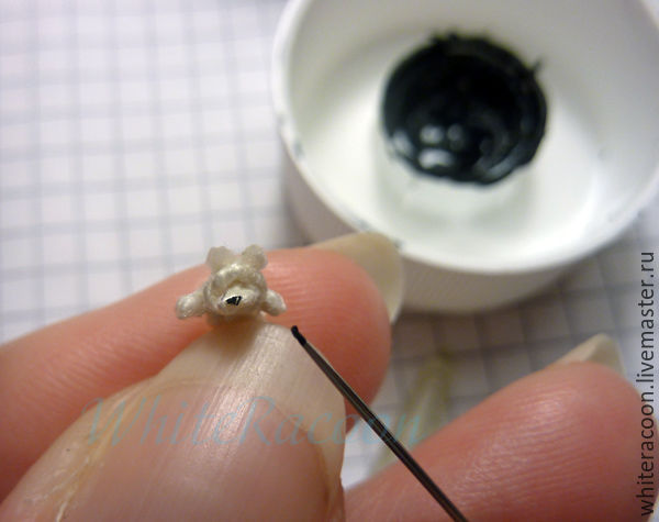 Теперь мишке нужна глаза-нос-рот. Их рисуем. Можно попробовать микробисер, мне великовато оказалось, потому рисую.