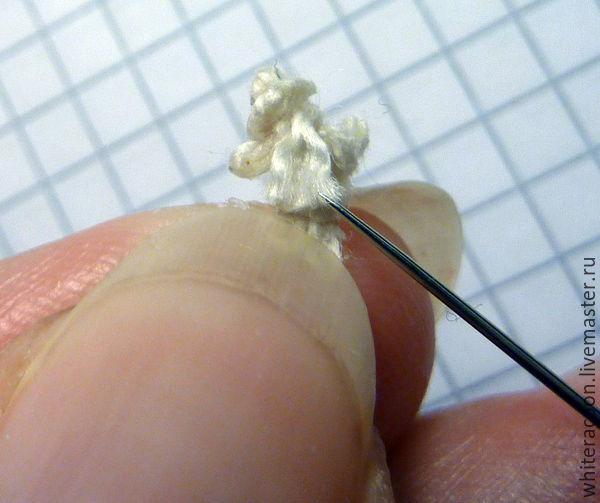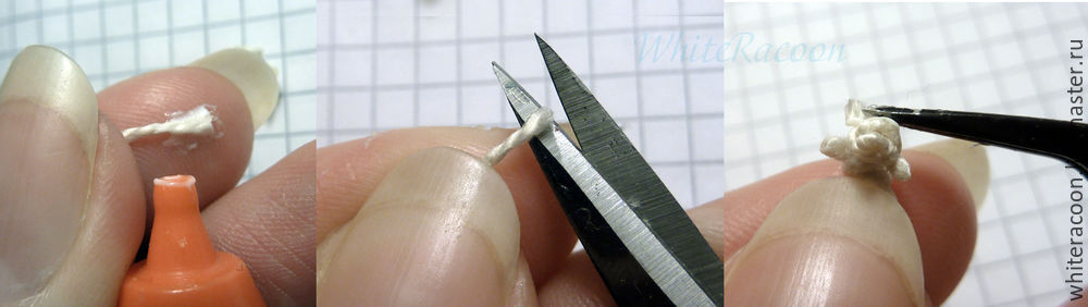 Нить обрезаем, иголкой/булавкой её распушаем на волокна, смазываем клем и приглаживаем к спинке.