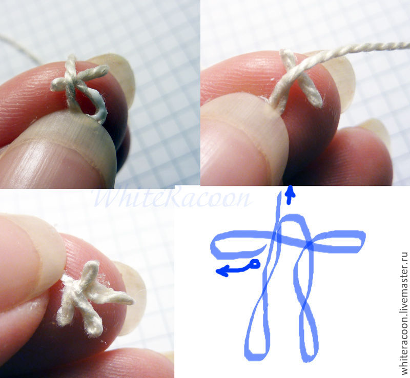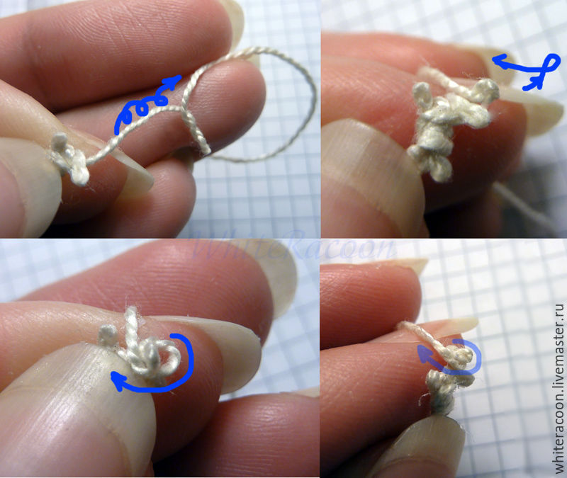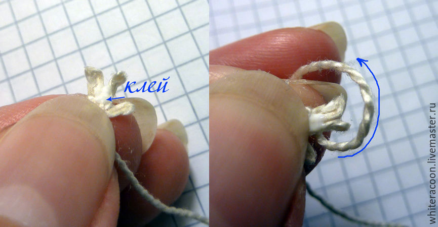 Наносим на конец нитки клей и сгибаем нитку, формируя "руку" длиной около 3 мм. Снова капаем клей чуть дальше, сгибаем нитку, формируя вторую "руку". Голубым показан ход нити. Когда ручки "схватились", зажимаем их пальцами (большим и указательным) и легонько прокатываем между ними, чтобы склеились прочнее и чуть "привалялись"