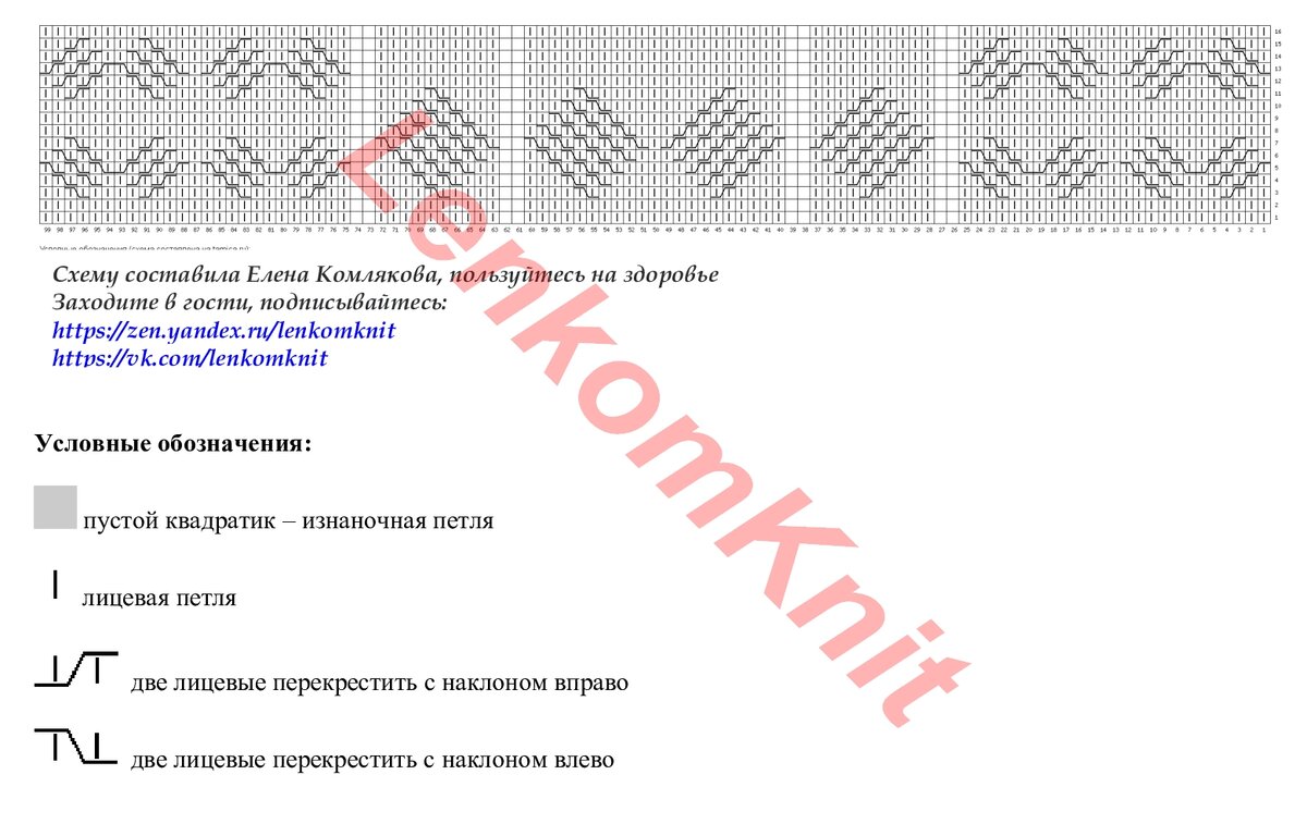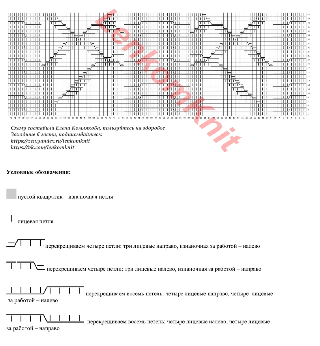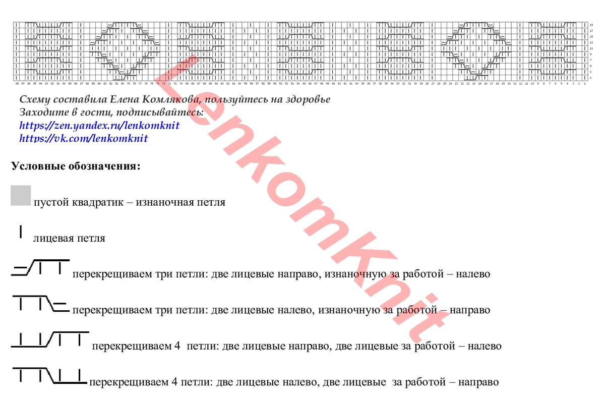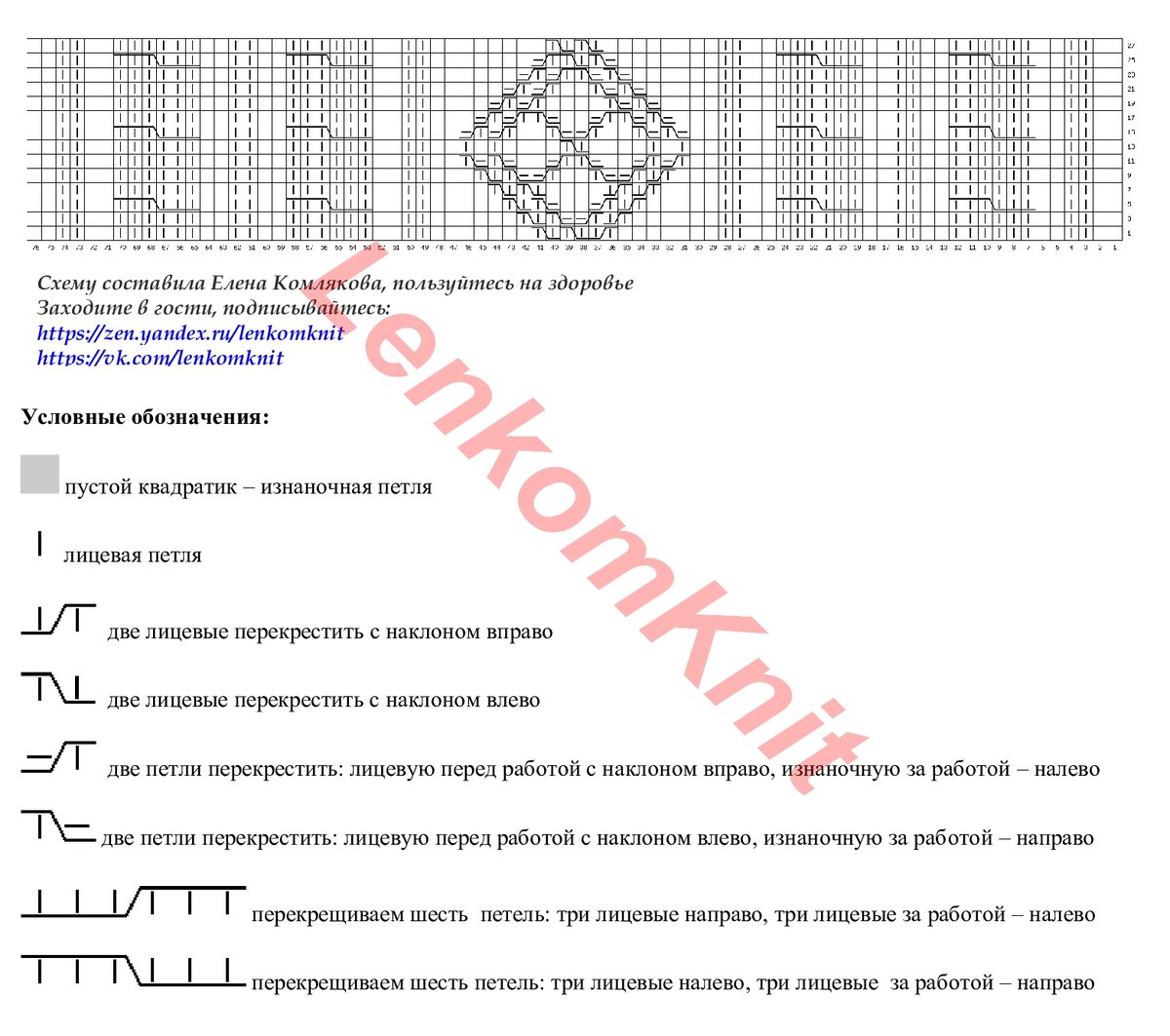 На рисунке - схема узора. Мне кажется, ромбы в этой модели очень плоские, и связаны не обычным перекрещиванием петель (две лицевые петли перекрещиваются с одной изнаночной), а поэтапным - по одной петле: