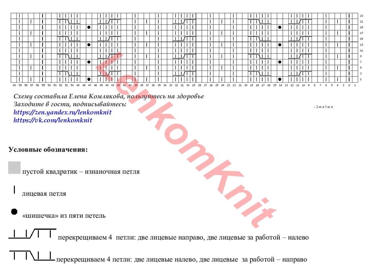 Это - схема узора верхней части свитера (классические жгуты, дорожки из лицевых петель и шишечки).