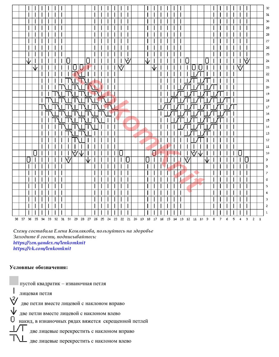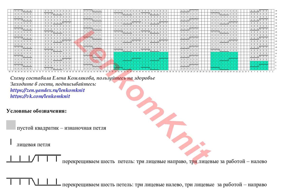 На рисунке - схема узора. Раппорт выделен зеленым цветом = 4 петли и 20 рядов.