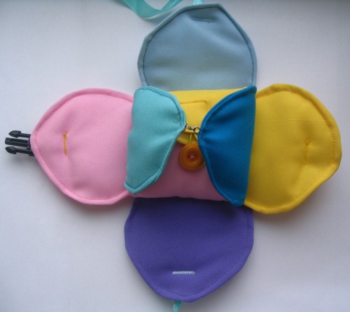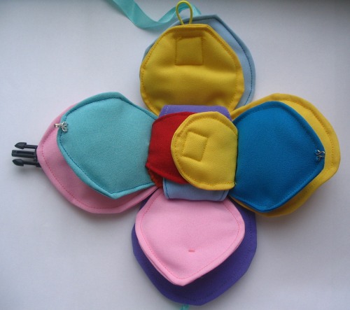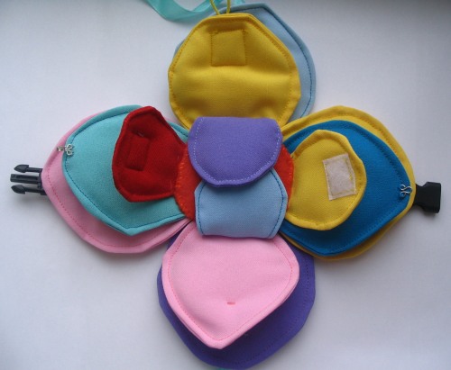 Цветок. Все лепестки из замши, отгибаются (пришиты у основания), шуршат, один не шуршит, внутри него пуговицы, ребенку надо на ощупь его отыскать. Вверху пришита бабочка. Листок тоже пришит у основания, внутри него бусинки.