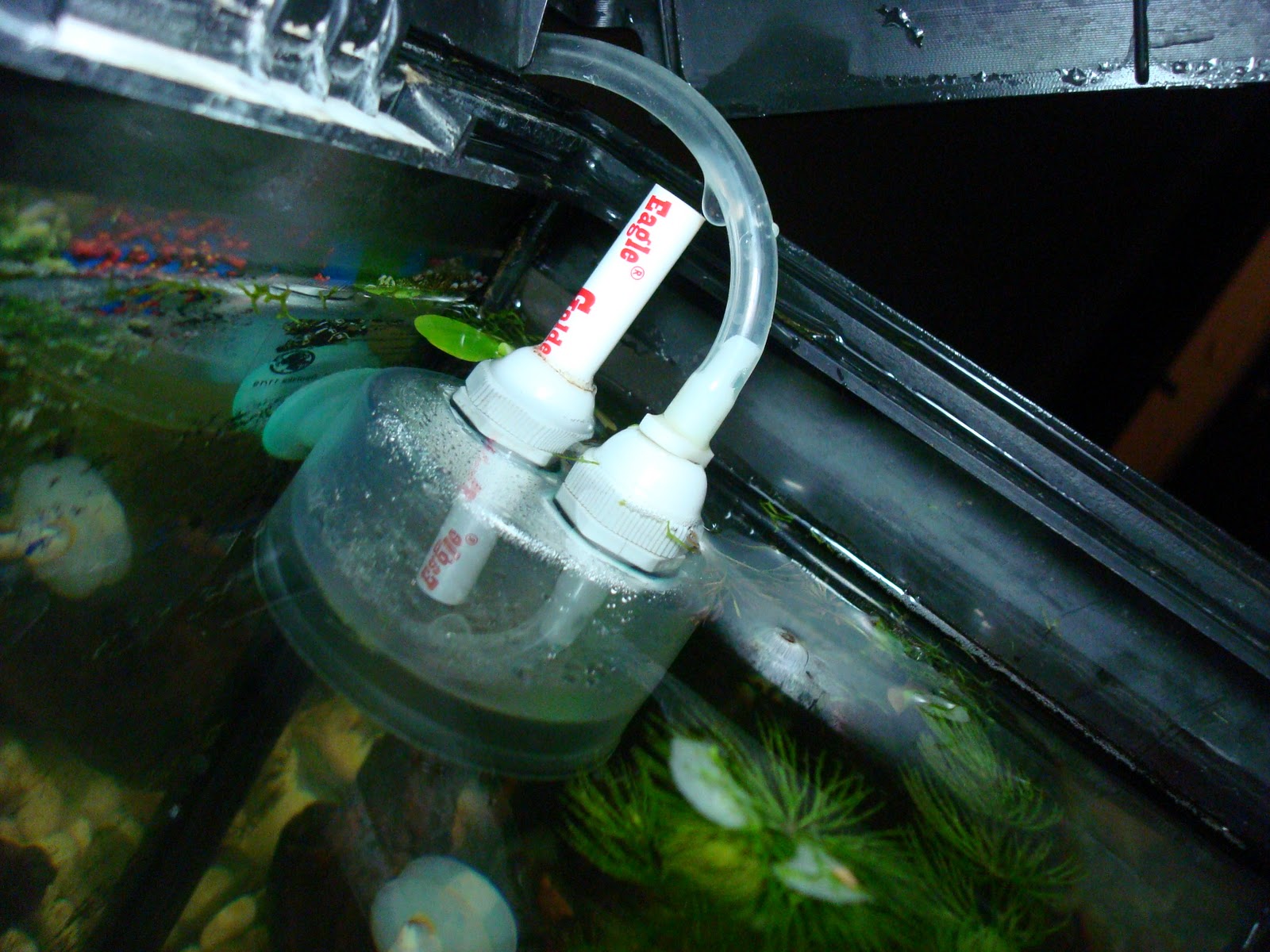 Вот мой самодельный реактор "колокол" для растворения CO2 в аквариуме. CO2 подается из маленькой (0.5 литра) батылочки с брагой. Газ хорошо растворяется в воде. На мой взгляд данный вариант реактора удобен по ряду причин:
