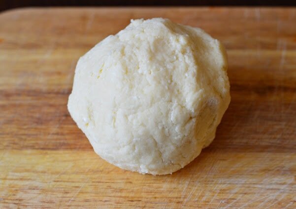 Добавляем муку и разрыхлитель, после чего месим, пока не получится компактный и слегка липкий шар. Муку добавляем понемногу, пока не получится оптимальная консистенция — мягкая и пластичная. Если сыр и творог недостаточно соленые, можно добавить еще немного соли.