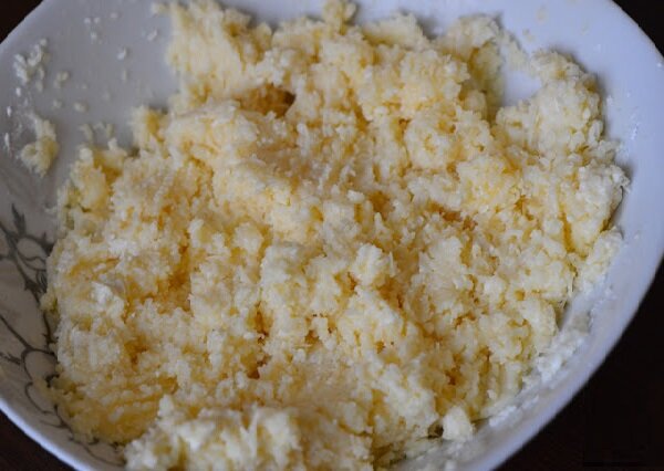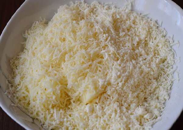 Натираем сыр и брынзу на крупной терке. У меня вместо брынзы был соленый овечий сыр. Можно использовать только твердый сыр, но мне сырные шарики больше нравятся в таком сочетании — сыр и брынза. Я заметила, что те, что только с сыром, становятся немного суше, когда они холодные. Любой творожный сыр добавляет мягкости, а брынза — еще немного остроты.
