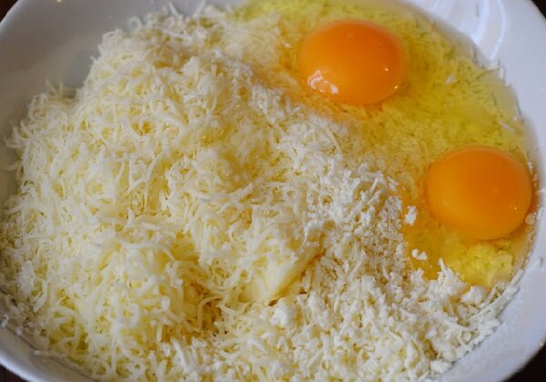 В миску с натертым сыром добавляем два яйца.