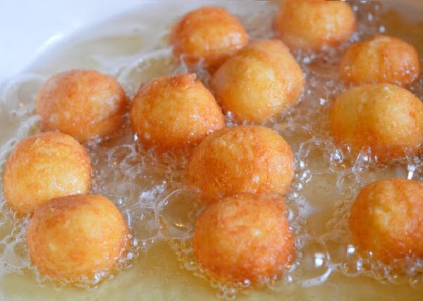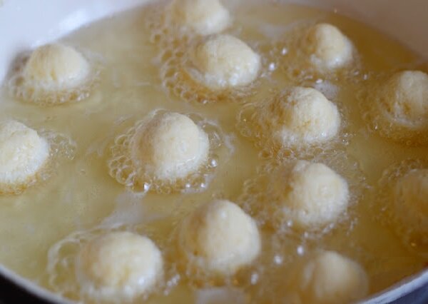 Разогреваем в небольшой кастрюле около 0,5 литра масла. Обжариваем шарики партиями — не кладите слишком много сразу, потому что они поднимутся на поверхность, а если их будет слишком много, они не прожарятся равномерно.