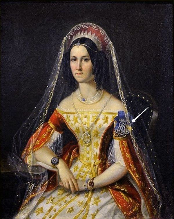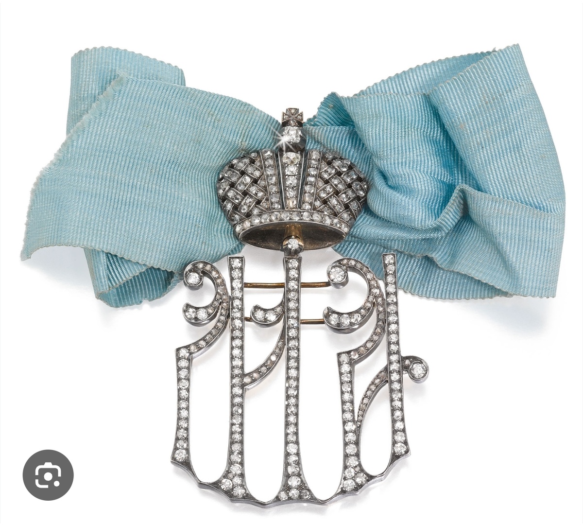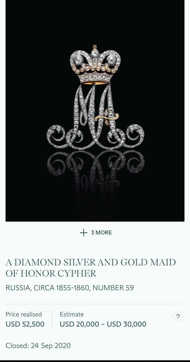 С 1855-го и по 1860-й в ходу был двойной шифр «МА» с инициалами Марии Александровны (жены Александра II) и Александры Федоровны (вдовы Николая I). Да, тот самый, что на фотографии аукционного дома Christie's. И именно получение этого двойного шифра описала в своем дневника от 13 марта 1855 года фрейлина императрицы Марии Александровны дочь русского поэта Федора Ивановича Тютчева, Анна Федоровна Тютчева: