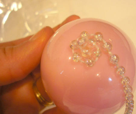 Начинаем работу с кончика яйца, но который выпускаем немного горячего клея и скрутив кончик нити с бусинками фиксируем его в этом месте, а следом начинаем спиралью накручивать всю длину нити до противоположного конца, который аналогично надо фиксировать клеем .