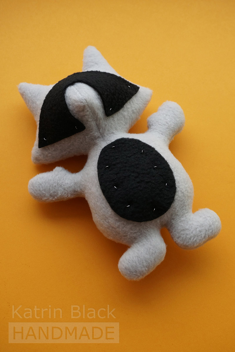 9. Вырезаем чёрные аппликации на животик и мордочку. Прикалываем булавками и аккуратно пришиваем швом через край.