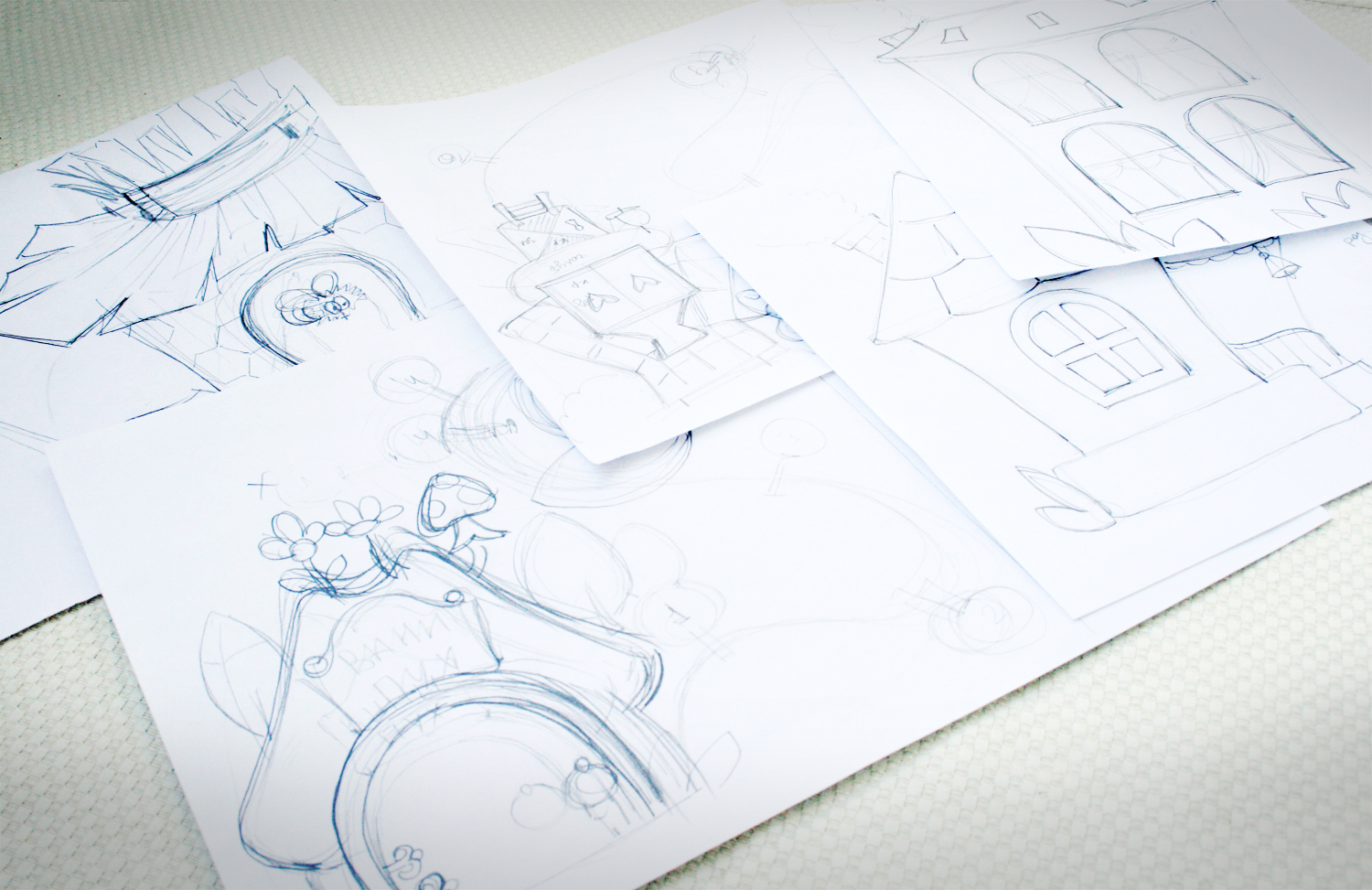 Пишу список развивающих элементов которые у меня набрались. Если много повторяющихся - отбрасываю, заменяю, добавляю недостающие желаемые. В миниатюрах легко изменять, отказываться или дорабатывать идею. Меньше тратится сил и времени, в сравнении с тем, если бы стразу начинать рисовать в полный формат, а потом передумать, изменять и прочее.