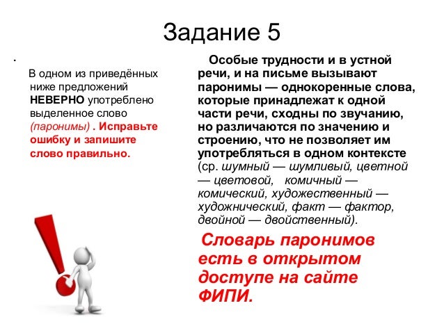 9. Задание 5 . В одном из приведённых ниже предложений НЕВЕРНО употреблено выделенное слово (паронимы) . Исправьте ошибку и запишите слово правильно. Особые трудности и в устной речи, и на письме вызывают паронимы — однокоренные слова, которые принадлежат к одной части речи, сходны по звучанию, но различаются по значению и строению, что не позволяет им употребляться в одном контексте (ср. шумный — шумливый, цветной — цветовой, комичный — комический, художественный — художнический, факт — фактор, двойной — двойственный). Словарь паронимов есть в открытом доступе на сайте ФИПИ.