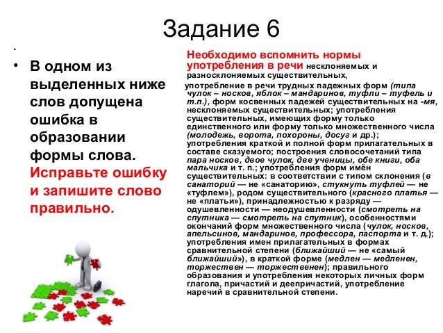 10. Задание 6 . • В одном из выделенных ниже слов допущена ошибка в образовании формы слова. Исправьте ошибку и запишите слово правильно. Необходимо вспомнить нормы употребления в речи несклоняемых и разносклоняемых существительных, употребление в речи трудных падежных форм (типа чулок – носков, яблок – мандаринов, туфли – туфель и т.п.), форм косвенных падежей существительных на -мя, несклоняемых существительных; употребления существительных, имеющих форму только единственного или форму только множественного числа (молодежь, ворота, похороны, досуг и др.); употребления краткой и полной форм прилагательных в составе сказуемого; построения словосочетаний типа пара носков, двое чулок, две ученицы, обе книги, оба мальчика и т. п.; употребления форм имён существительных: в соответствии с типом склонения (в санаторий — не «санаторию», стукнуть туфлей — не «туфлем»), родом существительного (красного платья — не «платьи»), принадлежностью к разряду — одушевленности — неодушевленности (смотреть на спутника — смотреть на спутник), особенностями окончаний форм множественного числа (чулок, носков, апельсинов, мандаринов, профессора, паспорта и т. д.); употребления имен прилагательных в формах сравнительной степени (ближайший — не «самый ближайший»), в краткой форме (медлен — медленен, торжествен — торжественен); правильного образования и употребления некоторых личных форм глагола, причастий и деепричастий, употребление наречий в сравнительной степени.